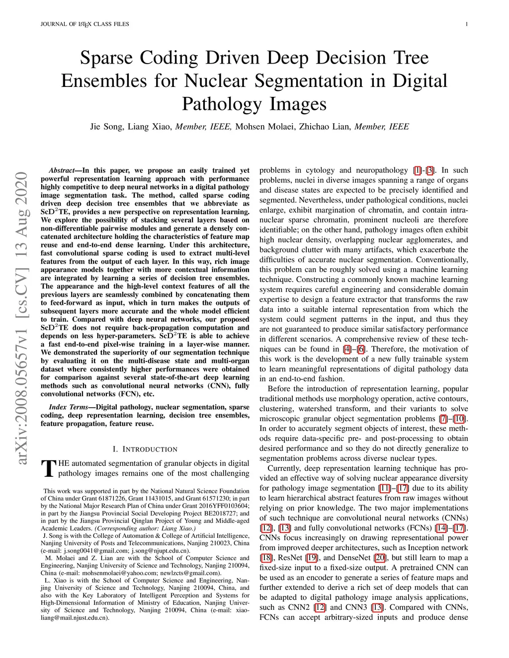 In this paper, we propose an easily trained yet powerful representation learning approach with performance highly competitive to deep neural networks in a digital pathology image segmentation task. The method, called sparse coding driven deep decision tree ensembles that we abbreviate as ScD2TE, provides a new perspective on representation learning. We explore the possibility of stacking several layers based on non-differentiable pairwise modules and generate a densely concatenated architecture holding the characteristics of feature map reuse and end-to-end dense learning. Under this architecture, fast convolutional sparse coding is used to extract multi-level features from the output of each layer. In this way, rich image appearance models together with more contextual information are integrated by learning a series of decision tree ensembles. The appearance and the high-level context features of all the previous layers are seamlessly combined by concatenating them to feed-forward as input, which in turn makes the outputs of subsequent layers more accurate and the whole model efficient to train. Compared with deep neural networks, our proposed ScD2TE does not require back-propagation computation and depends on less hyper-parameters. ScD2TE is able to achieve a fast end-to-end pixel-wise training in a layer-wise manner. We demonstrated the superiority of our segmentation technique by evaluating it on the multi-disease state and multi-organ dataset where consistently higher performances were obtained for comparison against several state-of-the-art deep learning methods such as convolutional neural networks (CNN), fully convolutional networks (FCN), etc.