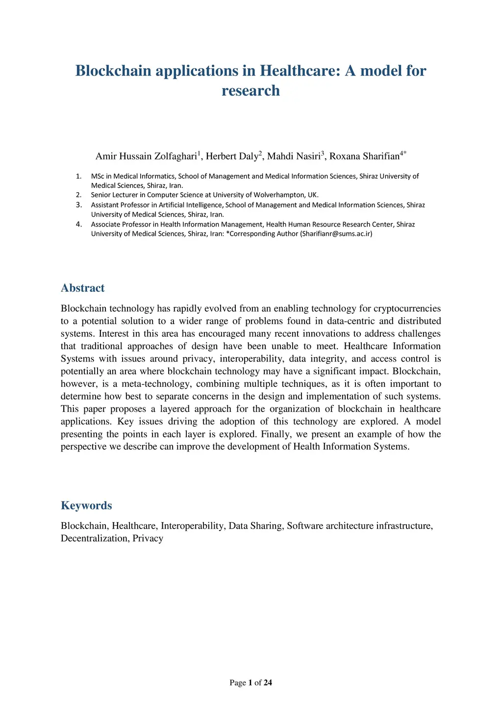 Blockchain applications in Healthcare: A model for research