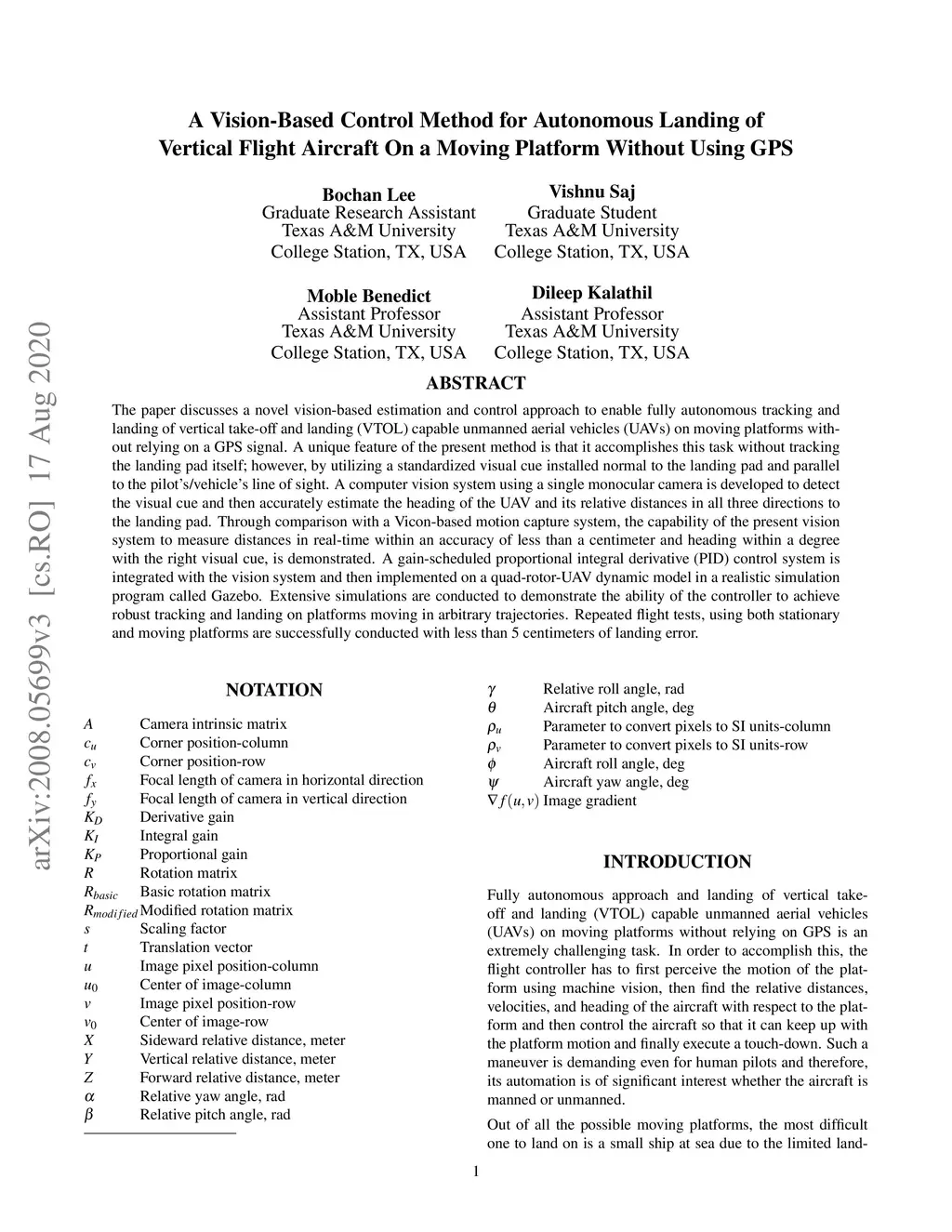 A Vision-Based Control Method for Autonomous Landing of Vertical Flight