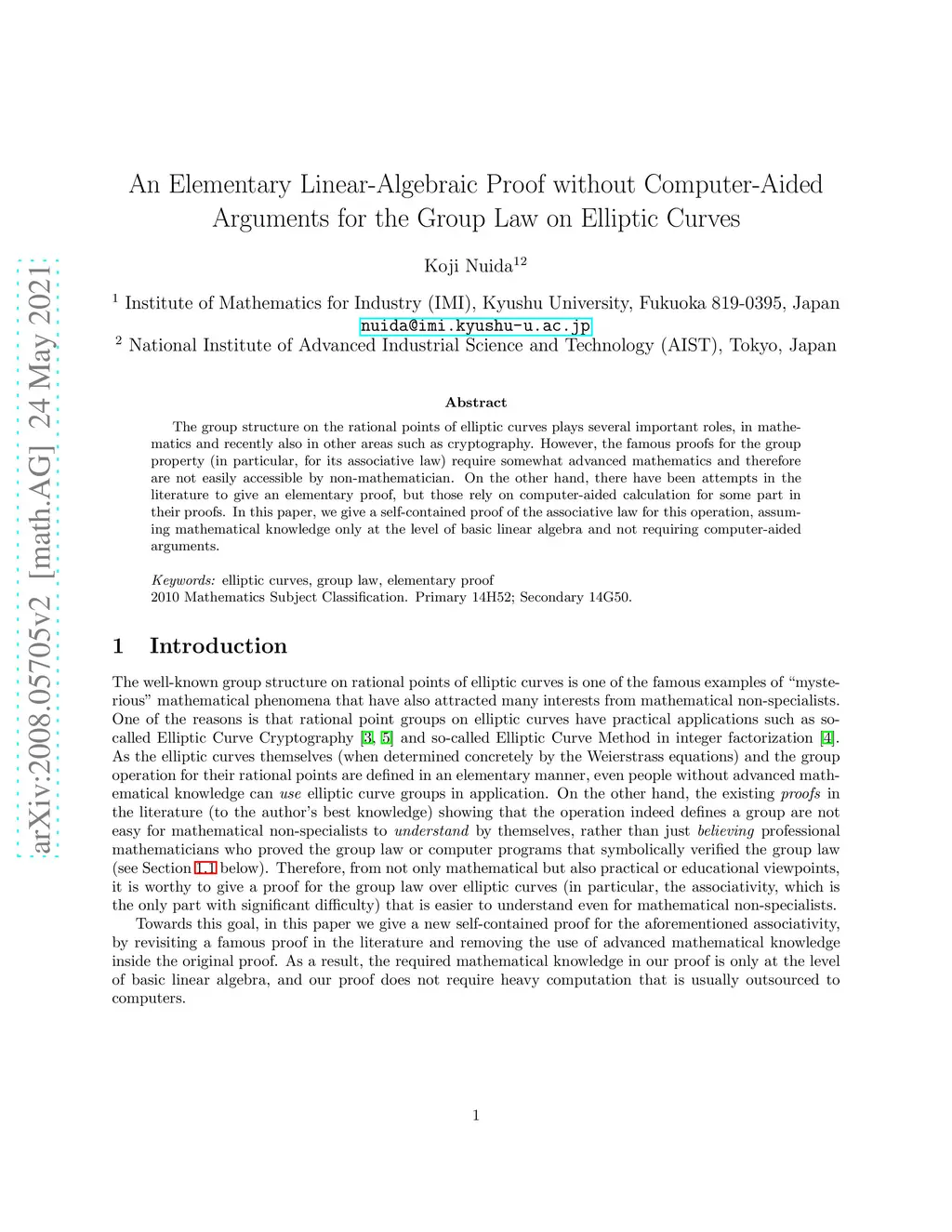 The group structure on the rational points of elliptic curves plays several important roles, in mathematics and recently also in other areas such as cryptography. However, the famous proofs for the group property (in particular, for its associative law) require somewhat advanced mathematics and therefore are not easily accessible by non-mathematician. On the other hand, there have been attempts in the literature to give an elementary proof, but those rely on computer-aided calculation for some part in their proofs. In this paper, we give a self-contained proof of the associative law for this operation, assuming mathematical knowledge only at the level of basic linear algebra and not requiring computer-aided arguments.