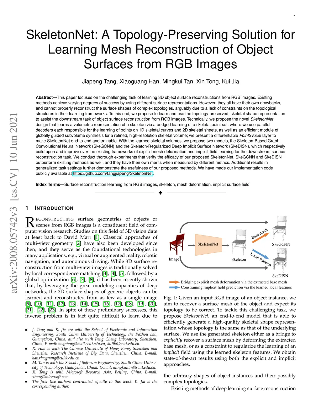 This paper focuses on the challenging task of learning 3D object surface reconstructions from RGB images. Existingmethods achieve varying degrees of success by using different surface representations. However, they all have their own drawbacks,and cannot properly reconstruct the surface shapes of complex topologies, arguably due to a lack of constraints on the topologicalstructures in their learning frameworks. To this end, we propose to learn and use the topology-preserved, skeletal shape representationto assist the downstream task of object surface reconstruction from RGB images. Technically, we propose the novelSkeletonNetdesign that learns a volumetric representation of a skeleton via a bridged learning of a skeletal point set, where we use paralleldecoders each responsible for the learning of points on 1D skeletal curves and 2D skeletal sheets, as well as an efficient module ofglobally guided subvolume synthesis for a refined, high-resolution skeletal volume; we present a differentiablePoint2Voxellayer tomake SkeletonNet end-to-end and trainable. With the learned skeletal volumes, we propose two models, the Skeleton-Based GraphConvolutional Neural Network (SkeGCNN) and the Skeleton-Regularized Deep Implicit Surface Network (SkeDISN), which respectivelybuild upon and improve over the existing frameworks of explicit mesh deformation and implicit field learning for the downstream surfacereconstruction task. We conduct thorough experiments that verify the efficacy of our proposed SkeletonNet. SkeGCNN and SkeDISNoutperform existing methods as well, and they have their own merits when measured by different metrics. Additional results ingeneralized task settings further demonstrate the usefulness of our proposed methods. We have made both our implementation codeand the ShapeNet-Skeleton dataset publicly available at ble at https://github.com/tangjiapeng/SkeletonNet.