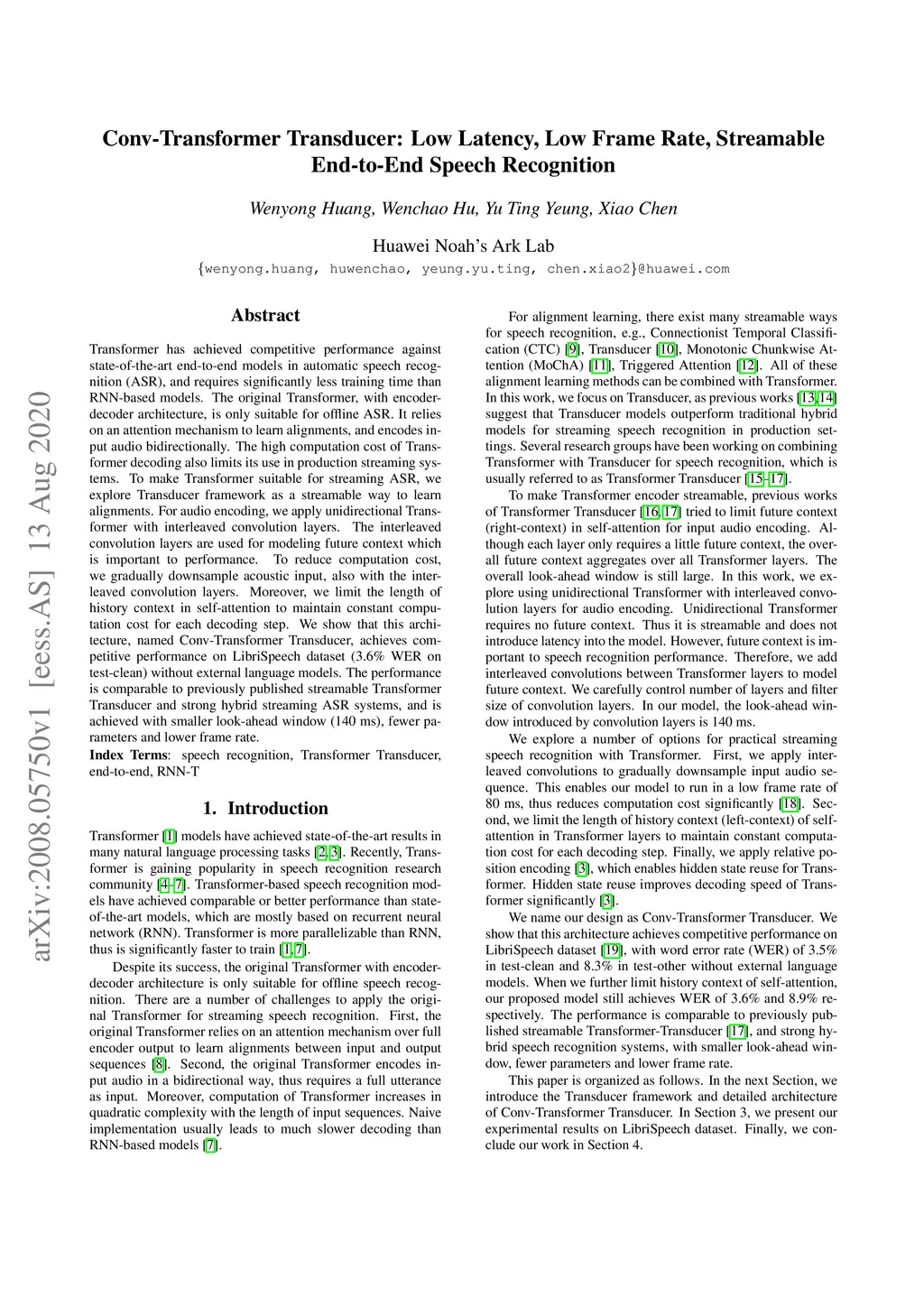 Transformer has achieved competitive performance against state-of-the-art end-to-end models in automatic speech recognition (ASR), and requires significantly less training time than RNN-based models. The original Transformer, with encoder-decoder architecture, is only suitable for offline ASR. It relies on an attention mechanism to learn alignments, and encodes input audio bidirectionally. The high computation cost of Transformer decoding also limits its use in production streaming systems. To make Transformer suitable for streaming ASR, we explore Transducer framework as a streamable way to learn alignments. For audio encoding, we apply unidirectional Transformer with interleaved convolution layers. The interleaved convolution layers are used for modeling future context which is important to performance. To reduce computation cost, we gradually downsample acoustic input, also with the interleaved convolution layers. Moreover, we limit the length of history context in self-attention to maintain constant computation cost for each decoding step. We show that this architecture, named Conv-Transformer Transducer, achieves competitive performance on LibriSpeech dataset (3.6\% WER on test-clean) without external language models. The performance is comparable to previously published streamable Transformer Transducer and strong hybrid streaming ASR systems, and is achieved with smaller look-ahead window (140~ms), fewer parameters and lower frame rate.