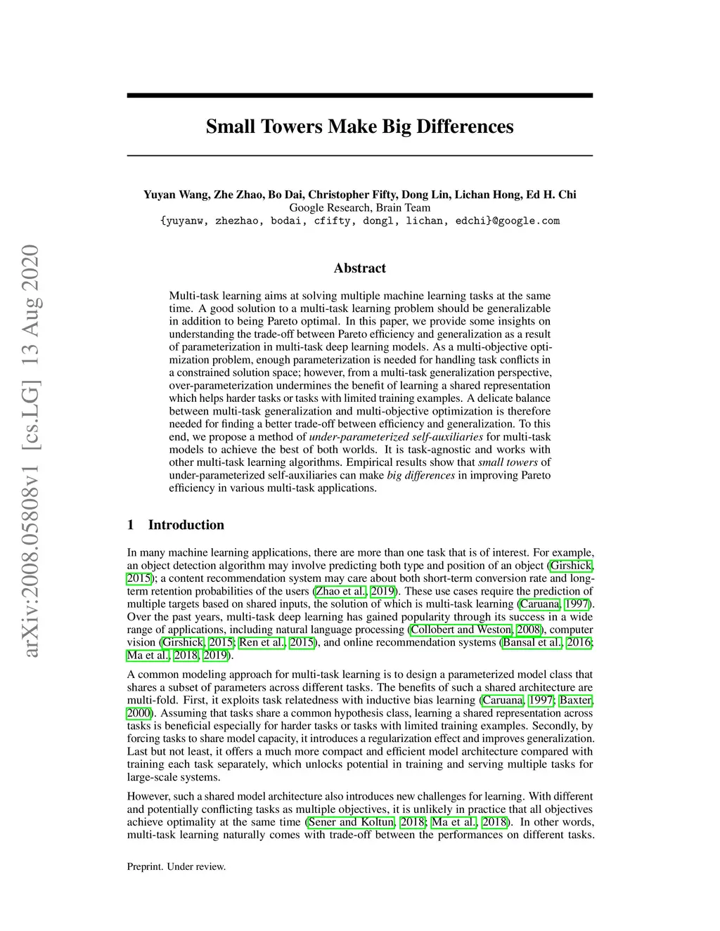 Multi-task learning aims at solving multiple machine learning tasks at the same time. A good solution to a multi-task learning problem should be generalizable in addition to being Pareto optimal. In this paper, we provide some insights on understanding the trade-off between Pareto efficiency and generalization as a result of parameterization in multi-task deep learning models. As a multi-objective optimization problem, enough parameterization is needed for handling task conflicts in a constrained solution space; however, from a multi-task generalization perspective, over-parameterization undermines the benefit of learning a shared representation which helps harder tasks or tasks with limited training examples. A delicate balance between multi-task generalization and multi-objective optimization is therefore needed for finding a better trade-off between efficiency and generalization. To this end, we propose a method of under-parameterized self-auxiliaries for multi-task models to achieve the best of both worlds. It is task-agnostic and works with other multi-task learning algorithms. Empirical results show that small towers of under-parameterized self-auxiliaries can make big differences in improving Pareto efficiency in various multi-task applications.