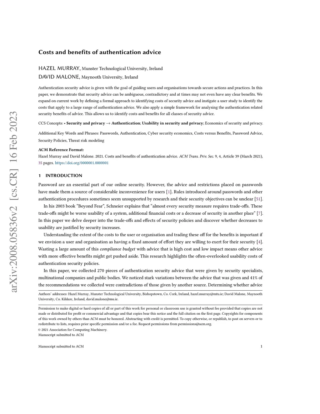 Authentication security advice is given with the goal of guiding users and organisations towards secure actions and practices. In this paper, we demonstrate that security advice can be ambiguous, contradictory and at times may not even have any clear benefits. We expand on current work by defining a formal approach to identifying costs of security advice and instigate a user study to identify the costs that apply to a large range of authentication advice. We also apply a simple framework for analysing the authentication related security benefits of advice. This allows us to identify costs and benefits for all classes of security advice.