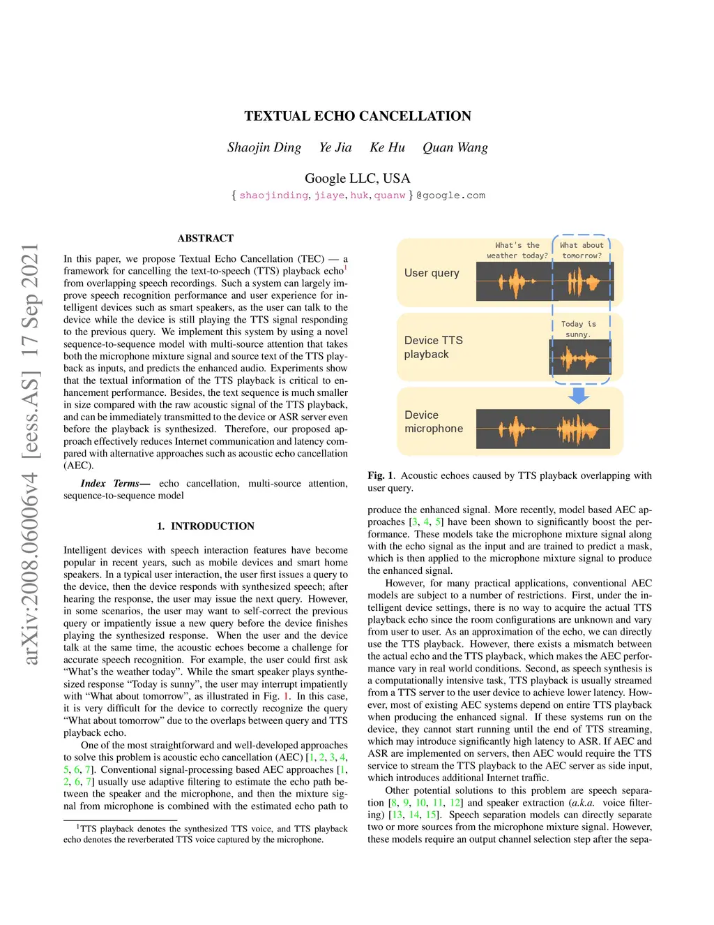 In this paper, we propose Textual Echo Cancellation (TEC) - a framework for cancelling the text-to-speech (TTS) playback echo from overlapping speech recordings. Such a system can largely improve speech recognition performance and user experience for intelligent devices such as smart speakers, as the user can talk to the device while the device is still playing the TTS signal responding to the previous query. We implement this system by using a novel sequence-to-sequence model with multi-source attention that takes both the microphone mixture signal and source text of the TTS playback as inputs, and predicts the enhanced audio. Experiments show that the textual information of the TTS playback is critical to enhancement performance. Besides, the text sequence is much smaller in size compared with the raw acoustic signal of the TTS playback, and can be immediately transmitted to the device or ASR server even before the playback is synthesized. Therefore, our proposed approach effectively reduces Internet communication and latency compared with alternative approaches such as acoustic echo cancellation (AEC).