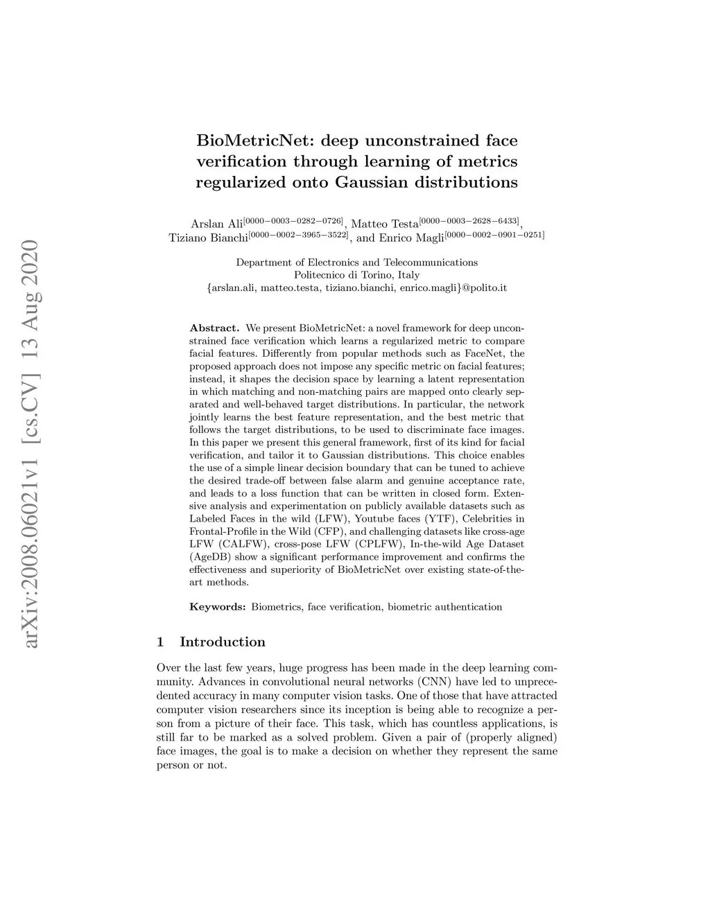 We present BioMetricNet: a novel framework for deep unconstrained face verification which learns a regularized metric to compare facial features. Differently from popular methods such as FaceNet, the proposed approach does not impose any specific metric on facial features; instead, it shapes the decision space by learning a latent representation in which matching and non-matching pairs are mapped onto clearly separated and well-behaved target distributions. In particular, the network jointly learns the best feature representation, and the best metric that follows the target distributions, to be used to discriminate face images. In this paper we present this general framework, first of its kind for facial verification, and tailor it to Gaussian distributions. This choice enables the use of a simple linear decision boundary that can be tuned to achieve the desired trade-off between false alarm and genuine acceptance rate, and leads to a loss function that can be written in closed form. Extensive analysis and experimentation on publicly available datasets such as Labeled Faces in the wild (LFW), Youtube faces (YTF), Celebrities in Frontal-Profile in the Wild (CFP), and challenging datasets like cross-age LFW (CALFW), cross-pose LFW (CPLFW), In-the-wild Age Dataset (AgeDB) show a significant performance improvement and confirms the effectiveness and superiority of BioMetricNet over existing state-of-the-art methods.