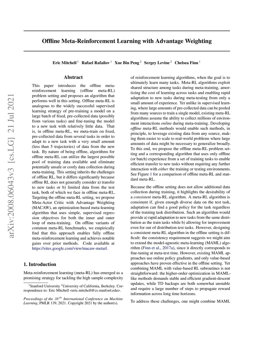 This paper introduces the offline meta-reinforcement learning (offline meta-RL) problem setting and proposes an algorithm that performs well in this setting. Offline meta-RL is analogous to the widely successful supervised learning strategy of pre-training a model on a large batch of fixed, pre-collected data (possibly from various tasks) and fine-tuning the model to a new task with relatively little data. That is, in offline meta-RL, we meta-train on fixed, pre-collected data from several tasks in order to adapt to a new task with a very small amount (less than 5 trajectories) of data from the new task. By nature of being offline, algorithms for offline meta-RL can utilize the largest possible pool of training data available and eliminate potentially unsafe or costly data collection during meta-training. This setting inherits the challenges of offline RL, but it differs significantly because offline RL does not generally consider a) transfer to new tasks or b) limited data from the test task, both of which we face in offline meta-RL. Targeting the offline meta-RL setting, we propose Meta-Actor Critic with Advantage Weighting (MACAW), an optimization-based meta-learning algorithm that uses simple, supervised regression objectives for both the inner and outer loop of meta-training. On offline variants of common meta-RL benchmarks, we empirically find that this approach enables fully offline meta-reinforcement learning and achieves notable gains over prior methods.
