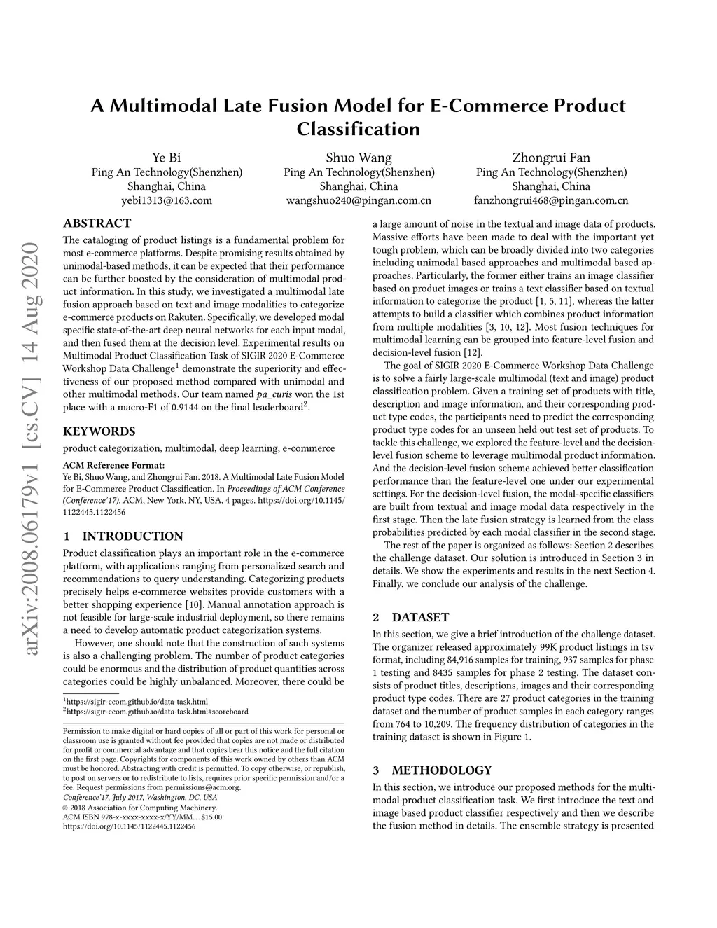 The cataloging of product listings is a fundamental problem for most e-commerce platforms. Despite promising results obtained by unimodal-based methods, it can be expected that their performance can be further boosted by the consideration of multimodal product information. In this study, we investigated a multimodal late fusion approach based on text and image modalities to categorize e-commerce products on Rakuten. Specifically, we developed modal specific state-of-the-art deep neural networks for each input modal, and then fused them at the decision level. Experimental results on Multimodal Product Classification Task of SIGIR 2020 E-Commerce Workshop Data Challenge demonstrate the superiority and effectiveness of our proposed method compared with unimodal and other multimodal methods. Our team named pa_curis won the 1st place with a macro-F1 of 0.9144 on the final leaderboard.