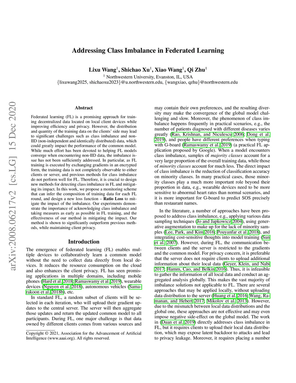 Federated learning (FL) is a promising approach for training decentralized data located on local client devices while improving efficiency and privacy. However, the distribution and quantity of the training data on the clients' side may lead to significant challenges such as class imbalance and non-IID (non-independent and identically distributed) data, which could greatly impact the performance of the common model. While much effort has been devoted to helping FL models converge when encountering non-IID data, the imbalance issue has not been sufficiently addressed. In particular, as FL training is executed by exchanging gradients in an encrypted form, the training data is not completely observable to either clients or servers, and previous methods for class imbalance do not perform well for FL. Therefore, it is crucial to design new methods for detecting class imbalance in FL and mitigating its impact. In this work, we propose a monitoring scheme that can infer the composition of training data for each FL round, and design a new loss function -- \textbf{Ratio Loss} to mitigate the impact of the imbalance. Our experiments demonstrate the importance of acknowledging class imbalance and taking measures as early as possible in FL training, and the effectiveness of our method in mitigating the impact. Our method is shown to significantly outperform previous methods, while maintaining client privacy.