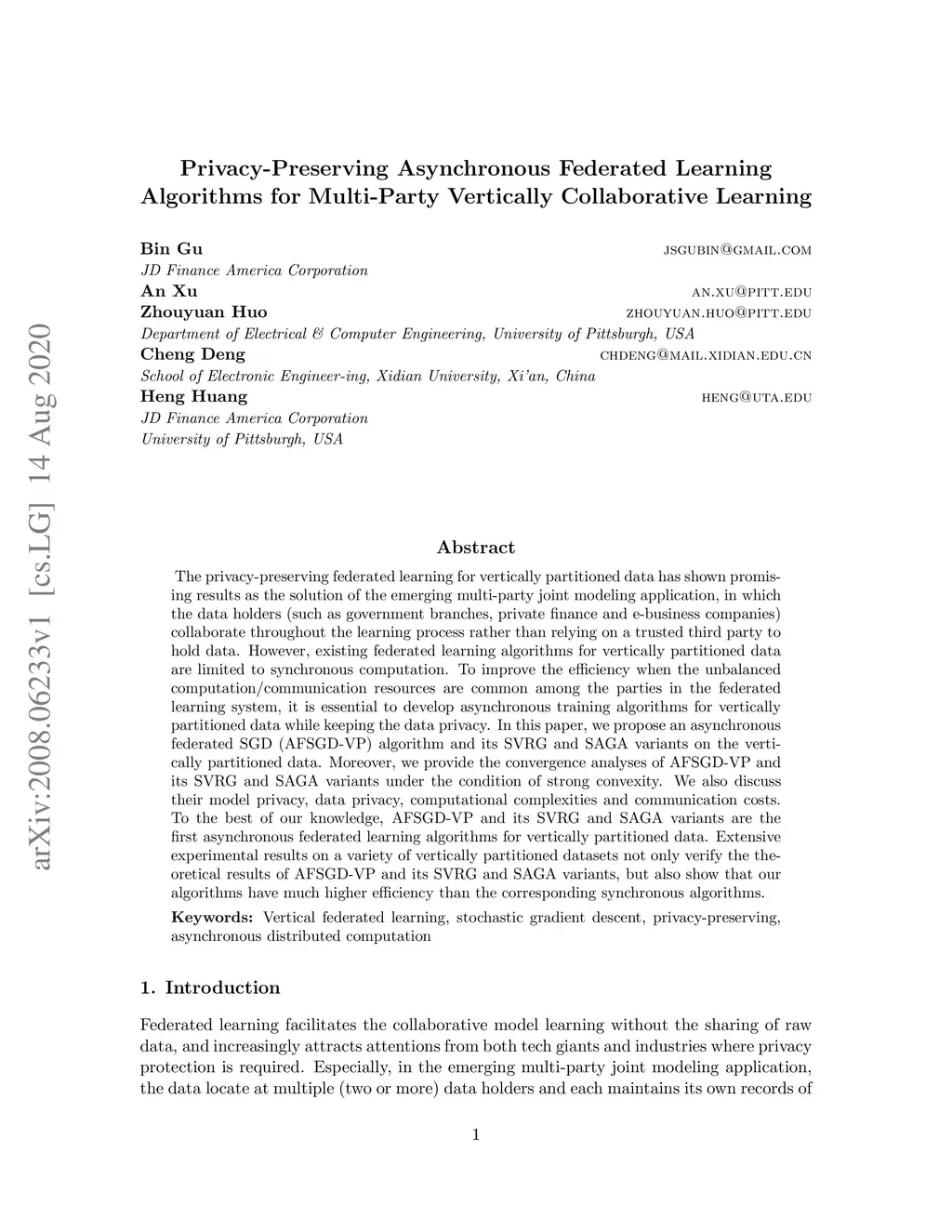 The privacy-preserving federated learning for vertically partitioned data has shown promising results as the solution of the emerging multi-party joint modeling application, in which the data holders (such as government branches, private finance and e-business companies) collaborate throughout the learning process rather than relying on a trusted third party to hold data. However, existing federated learning algorithms for vertically partitioned data are limited to synchronous computation. To improve the efficiency when the unbalanced computation/communication resources are common among the parties in the federated learning system, it is essential to develop asynchronous training algorithms for vertically partitioned data while keeping the data privacy. In this paper, we propose an asynchronous federated SGD (AFSGD-VP) algorithm and its SVRG and SAGA variants on the vertically partitioned data. Moreover, we provide the convergence analyses of AFSGD-VP and its SVRG and SAGA variants under the condition of strong convexity. We also discuss their model privacy, data privacy, computational complexities and communication costs. To the best of our knowledge, AFSGD-VP and its SVRG and SAGA variants are the first asynchronous federated learning algorithms for vertically partitioned data. Extensive experimental results on a variety of vertically partitioned datasets not only verify the theoretical results of AFSGD-VP and its SVRG and SAGA variants, but also show that our algorithms have much higher efficiency than the corresponding synchronous algorithms.