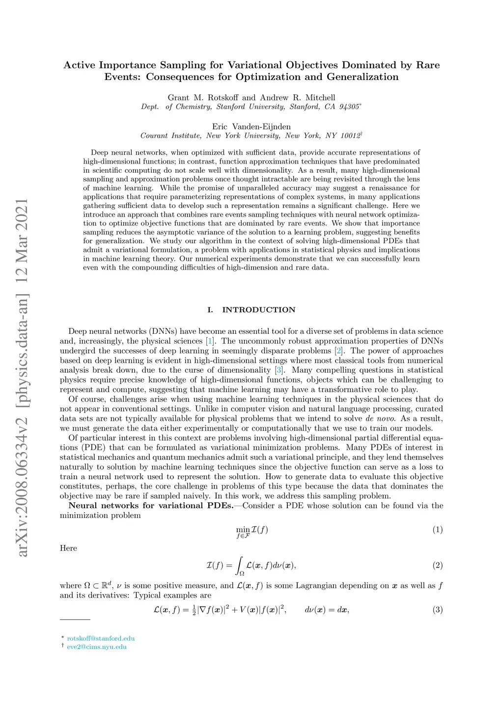 Deep neural networks, when optimized with sufficient data, provide accurate representations of high-dimensional functions; in contrast, function approximation techniques that have predominated in scientific computing do not scale well with dimensionality. As a result, many high-dimensional sampling and approximation problems once thought intractable are being revisited through the lens of machine learning. While the promise of unparalleled accuracy may suggest a renaissance for applications that require parameterizing representations of complex systems, in many applications gathering sufficient data to develop such a representation remains a significant challenge. Here we introduce an approach that combines rare events sampling techniques with neural network optimization to optimize objective functions that are dominated by rare events. We show that importance sampling reduces the asymptotic variance of the solution to a learning problem, suggesting benefits for generalization. We study our algorithm in the context of learning dynamical transition pathways between two states of a system, a problem with applications in statistical physics and implications in machine learning theory. Our numerical experiments demonstrate that we can successfully learn even with the compounding difficulties of high-dimension and rare data.