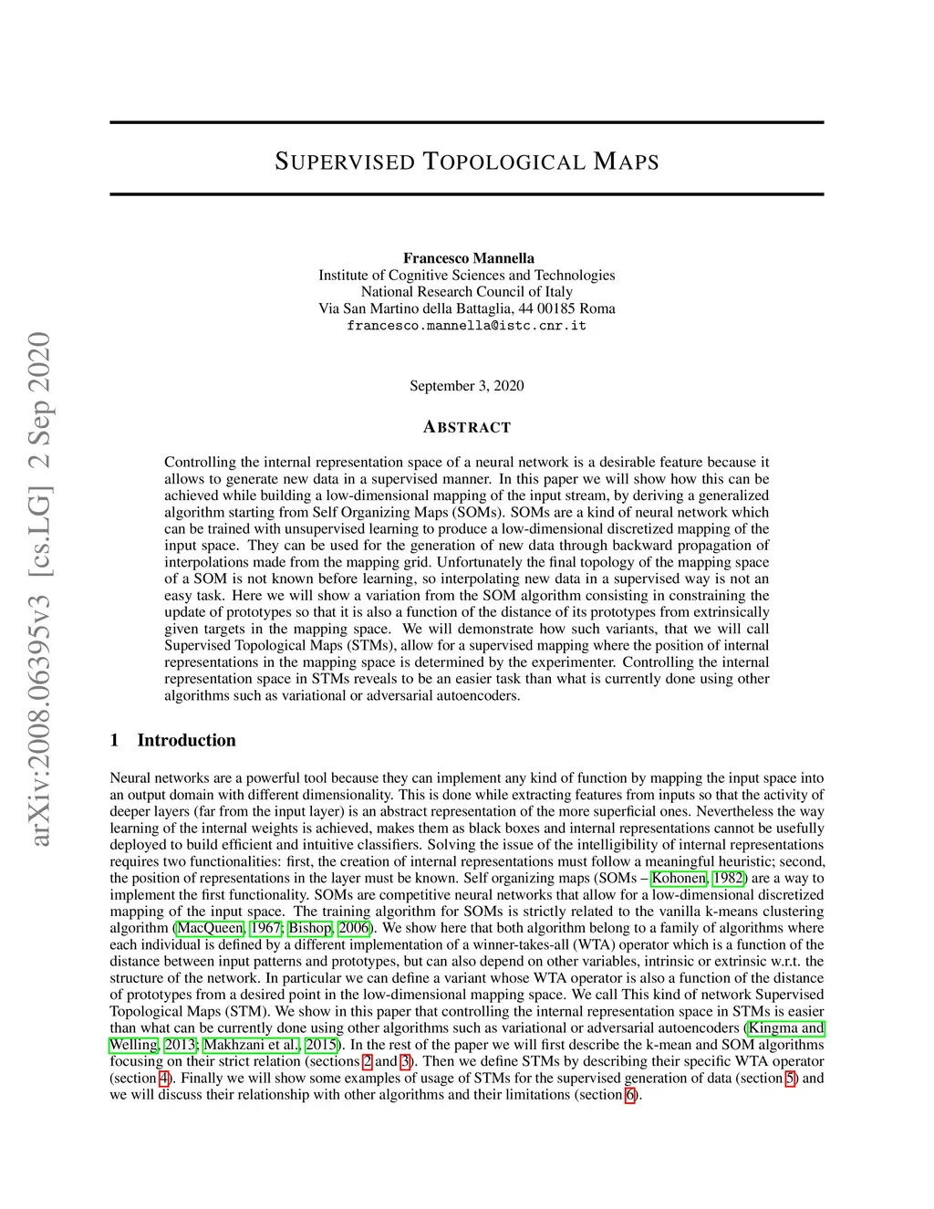Controlling the internal representation space of a neural network is a desirable feature because it allows to generate new data in a supervised manner. In this paper we will show how this can be achieved while building a low-dimensional mapping of the input stream, by deriving a generalized algorithm starting from Self Organizing Maps (SOMs). SOMs are a kind of neural network which can be trained with unsupervised learning to produce a low-dimensional discretized mapping of the input space. They can be used for the generation of new data through backward propagation of interpolations made from the mapping grid. Unfortunately the final topology of the mapping space of a SOM is not known before learning, so interpolating new data in a supervised way is not an easy task. Here we will show a variation from the SOM algorithm consisting in constraining the update of prototypes so that it is also a function of the distance of its prototypes from extrinsically given targets in the mapping space. We will demonstrate how such variants, that we will call Supervised Topological Maps (STMs), allow for a supervised mapping where the position of internal representations in the mapping space is determined by the experimenter. Controlling the internal representation space in STMs reveals to be an easier task than what is currently done using other algorithms such as variational or adversarial autoencoders.