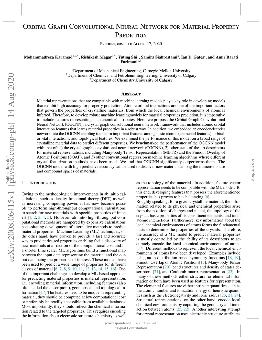 Material representations that are compatible with machine learning models play a key role in developing models that exhibit high accuracy for property prediction. Atomic orbital interactions are one of the important factors that govern the properties of crystalline materials, from which the local chemical environments of atoms is inferred. Therefore, to develop robust machine learningmodels for material properties prediction, it is imperative to include features representing such chemical attributes. Here, we propose the Orbital Graph Convolutional Neural Network (OGCNN), a crystal graph convolutional neural network framework that includes atomic orbital interaction features that learns material properties in a robust way. In addition, we embedded an encoder-decoder network into the OGCNN enabling it to learn important features among basic atomic (elemental features), orbital-orbital interactions, and topological features. We examined the performance of this model on a broad range of crystalline material data to predict different properties. We benchmarked the performance of the OGCNN model with that of: 1) the crystal graph convolutional neural network (CGCNN), 2) other state-of-the-art descriptors for material representations including Many-body Tensor Representation (MBTR) and the Smooth Overlap of Atomic Positions (SOAP), and 3) other conventional regression machine learning algorithms where different crystal featurization methods have been used. We find that OGCNN significantly outperforms them. The OGCNN model with high predictive accuracy can be used to discover new materials among the immense phase and compound spaces of materials