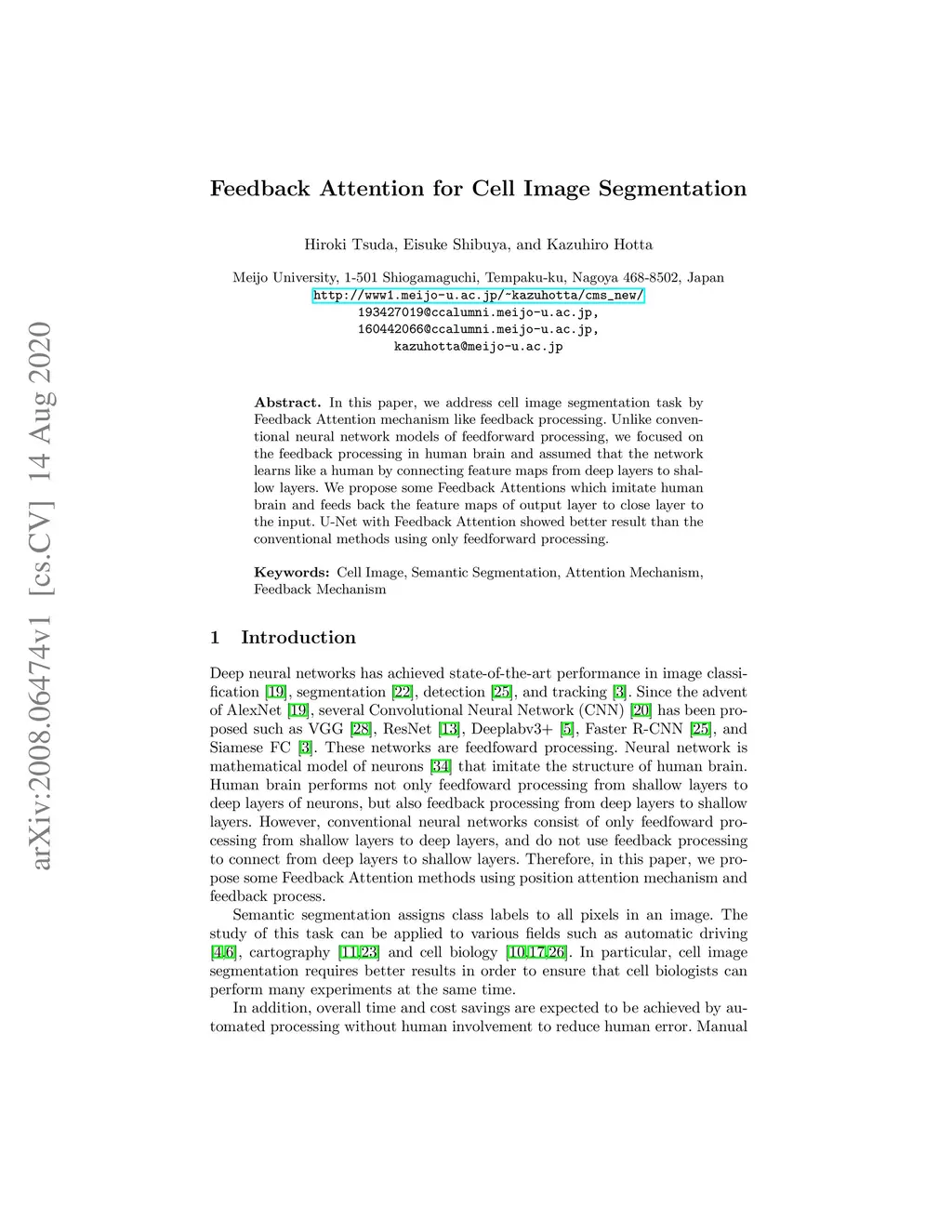 In this paper, we address cell image segmentation task by Feedback Attention mechanism like feedback processing. Unlike conventional neural network models of feedforward processing, we focused on the feedback processing in human brain and assumed that the network learns like a human by connecting feature maps from deep layers to shallow layers. We propose some Feedback Attentions which imitate human brain and feeds back the feature maps of output layer to close layer to the input. U-Net with Feedback Attention showed better result than the conventional methods using only feedforward processing.