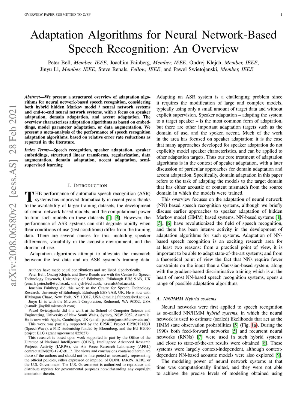 We present a structured overview of adaptation algorithms for neural network-based speech recognition, considering both hybrid hidden Markov model / neural network systems and end-to-end neural network systems, with a focus on speaker adaptation, domain adaptation, and accent adaptation. The overview characterizes adaptation algorithms as based on embeddings, model parameter adaptation, or data augmentation. We present a meta-analysis of the performance of speech recognition adaptation algorithms, based on relative error rate reductions as reported in the literature.