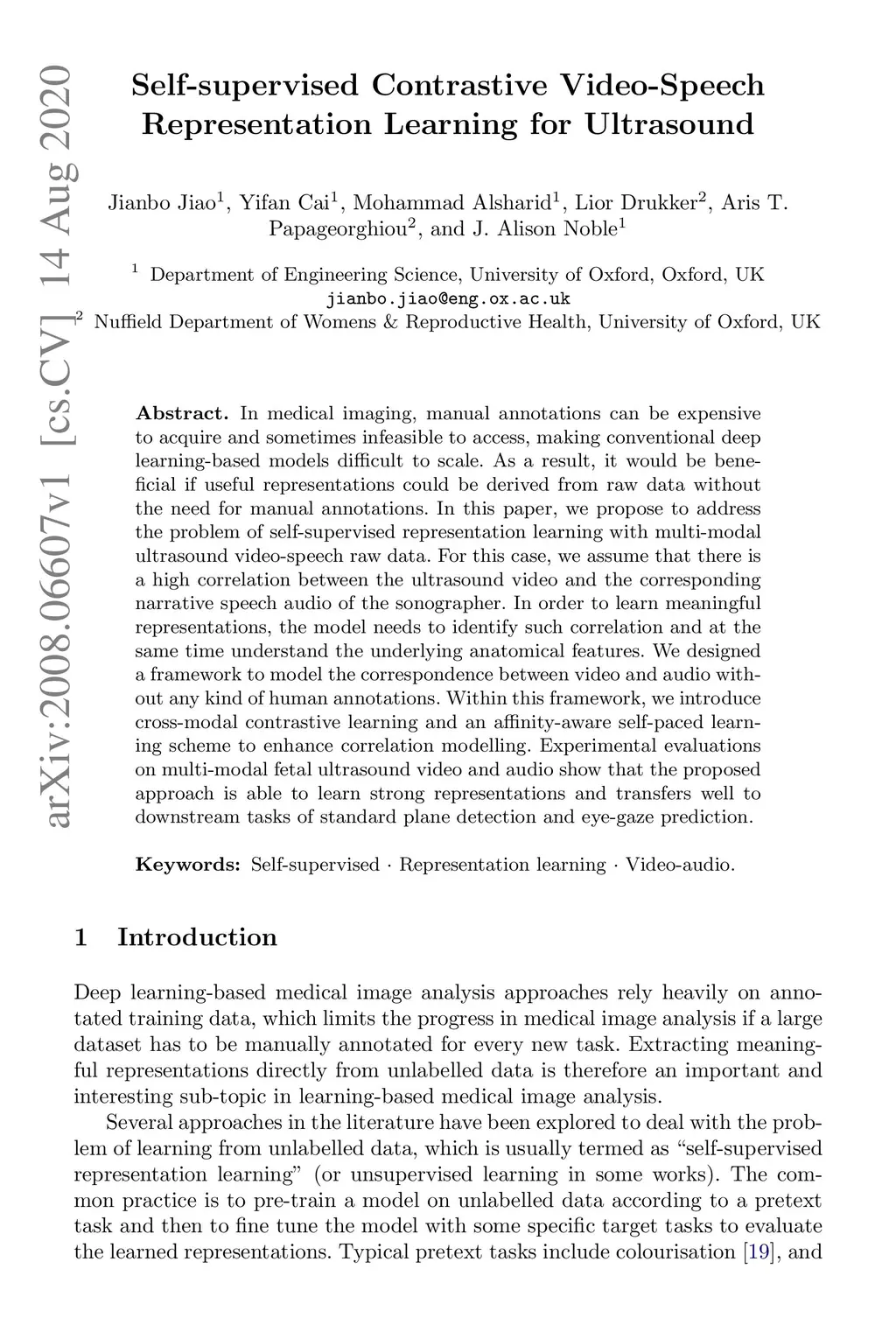 In medical imaging, manual annotations can be expensive to acquire and sometimes infeasible to access, making conventional deep learning-based models difficult to scale. As a result, it would be beneficial if useful representations could be derived from raw data without the need for manual annotations. In this paper, we propose to address the problem of self-supervised representation learning with multi-modal ultrasound video-speech raw data. For this case, we assume that there is a high correlation between the ultrasound video and the corresponding narrative speech audio of the sonographer. In order to learn meaningful representations, the model needs to identify such correlation and at the same time understand the underlying anatomical features. We designed a framework to model the correspondence between video and audio without any kind of human annotations. Within this framework, we introduce cross-modal contrastive learning and an affinity-aware self-paced learning scheme to enhance correlation modelling. Experimental evaluations on multi-modal fetal ultrasound video and audio show that the proposed approach is able to learn strong representations and transfers well to downstream tasks of standard plane detection and eye-gaze prediction.