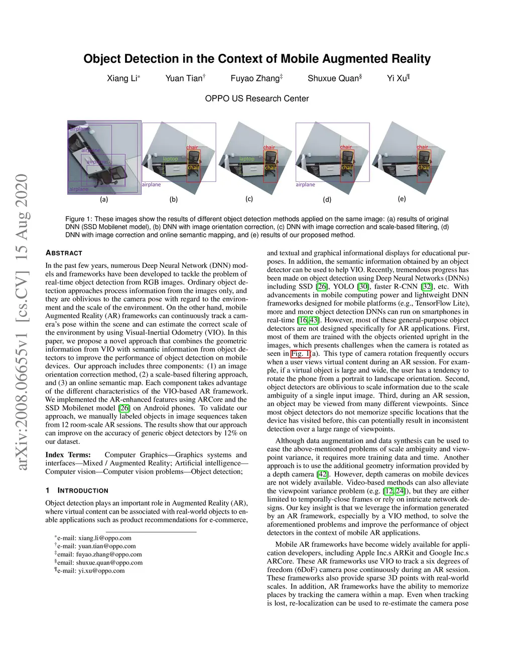 In the past few years, numerous Deep Neural Network (DNN) models and frameworks have been developed to tackle the problem of real-time object detection from RGB images. Ordinary object detection approaches process information from the images only, and they are oblivious to the camera pose with regard to the environment and the scale of the environment. On the other hand, mobile Augmented Reality (AR) frameworks can continuously track a camera's pose within the scene and can estimate the correct scale of the environment by using Visual-Inertial Odometry (VIO). In this paper, we propose a novel approach that combines the geometric information from VIO with semantic information from object detectors to improve the performance of object detection on mobile devices. Our approach includes three components: (1) an image orientation correction method, (2) a scale-based filtering approach, and (3) an online semantic map. Each component takes advantage of the different characteristics of the VIO-based AR framework. We implemented the AR-enhanced features using ARCore and the SSD Mobilenet model on Android phones. To validate our approach, we manually labeled objects in image sequences taken from 12 room-scale AR sessions. The results show that our approach can improve on the accuracy of generic object detectors by 12% on our dataset.