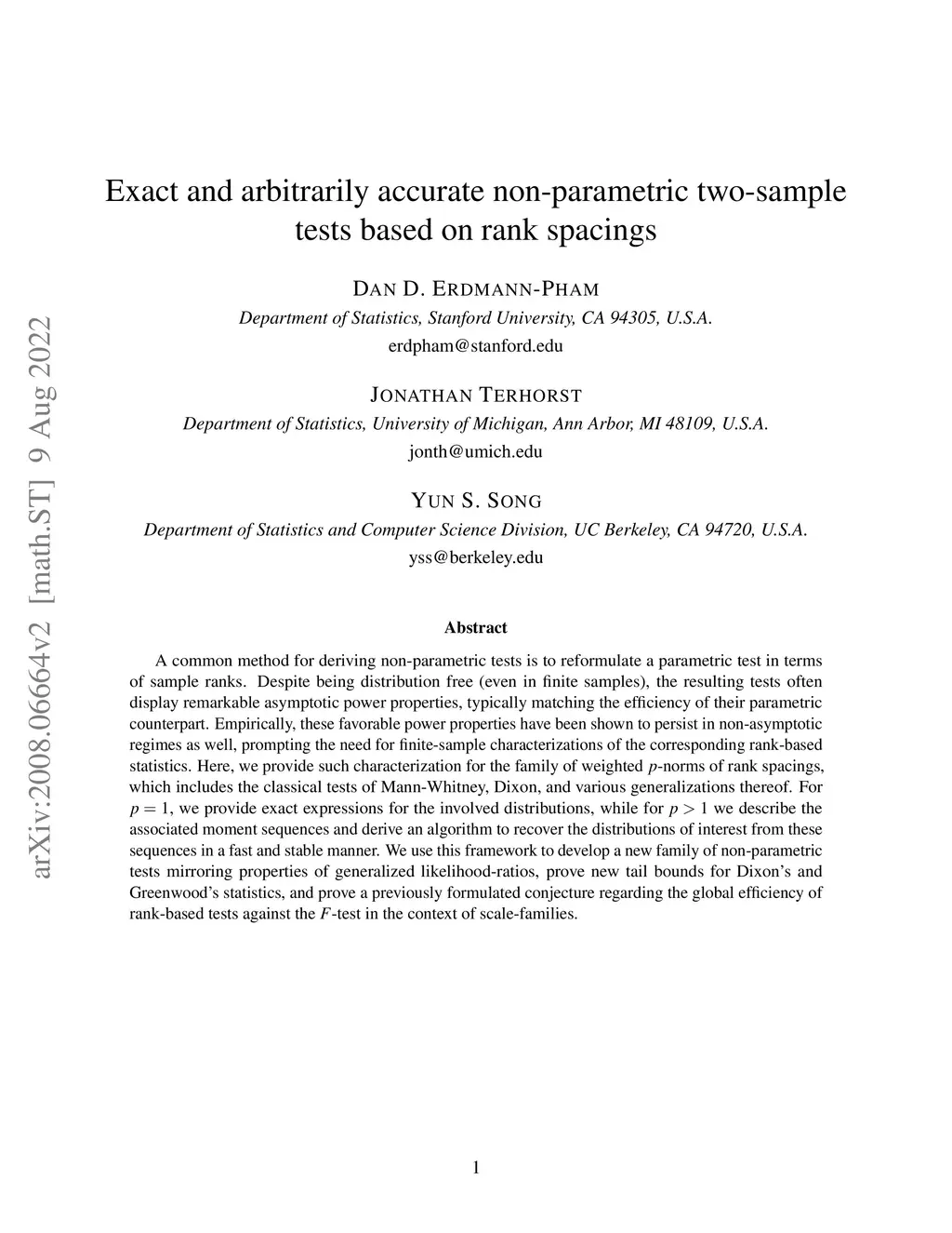 A common method for deriving non-parametric tests is to reformulate a parametric test in terms of sample ranks. Despite being distribution free (even in finite samples), the resulting tests often display remarkable asymptotic power properties, typically matching the efficiency of their parametric counterpart. Empirically, these favorable power properties have been shown to persist in non-asymptotic regimes as well, prompting the need for finite-sample characterizations of the corresponding rank-based statistics. Here, we provide such characterization for the family of weighted -norms of rank spacings, which includes the classical tests of Mann-Whitney, Dixon, and various generalizations thereof. For , we provide exact expressions for the involved distributions, while for we describe the associated moment sequences and derive an algorithm to recover the distributions of interest from these sequences in a fast and stable manner. We use this framework to develop a new family of non-parametric tests mirroring properties of generalized likelihood-ratios, prove new tail bounds for Dixon's and Greenwood's statistics, and prove a previously formulated conjecture regarding the global efficiency of rank-based tests against the -test in the context of scale-families.