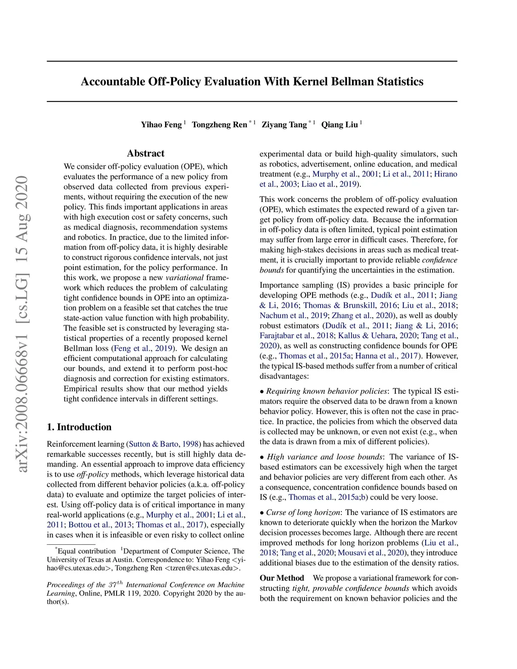 Accountable Off-Policy Evaluation With Kernel Bellman Statistics