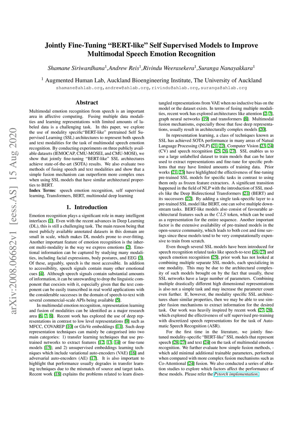 Multimodal emotion recognition from speech is an important area in affective computing. Fusing multiple data modalities and learning representations with limited amounts of labeled data is a challenging task. In this paper, we explore the use of modality-specific "BERT-like" pretrained Self Supervised Learning (SSL) architectures to represent both speech and text modalities for the task of multimodal speech emotion recognition. By conducting experiments on three publicly available datasets (IEMOCAP, CMU-MOSEI, and CMU-MOSI), we show that jointly fine-tuning "BERT-like" SSL architectures achieve state-of-the-art (SOTA) results. We also evaluate two methods of fusing speech and text modalities and show that a simple fusion mechanism can outperform more complex ones when using SSL models that have similar architectural properties to BERT.