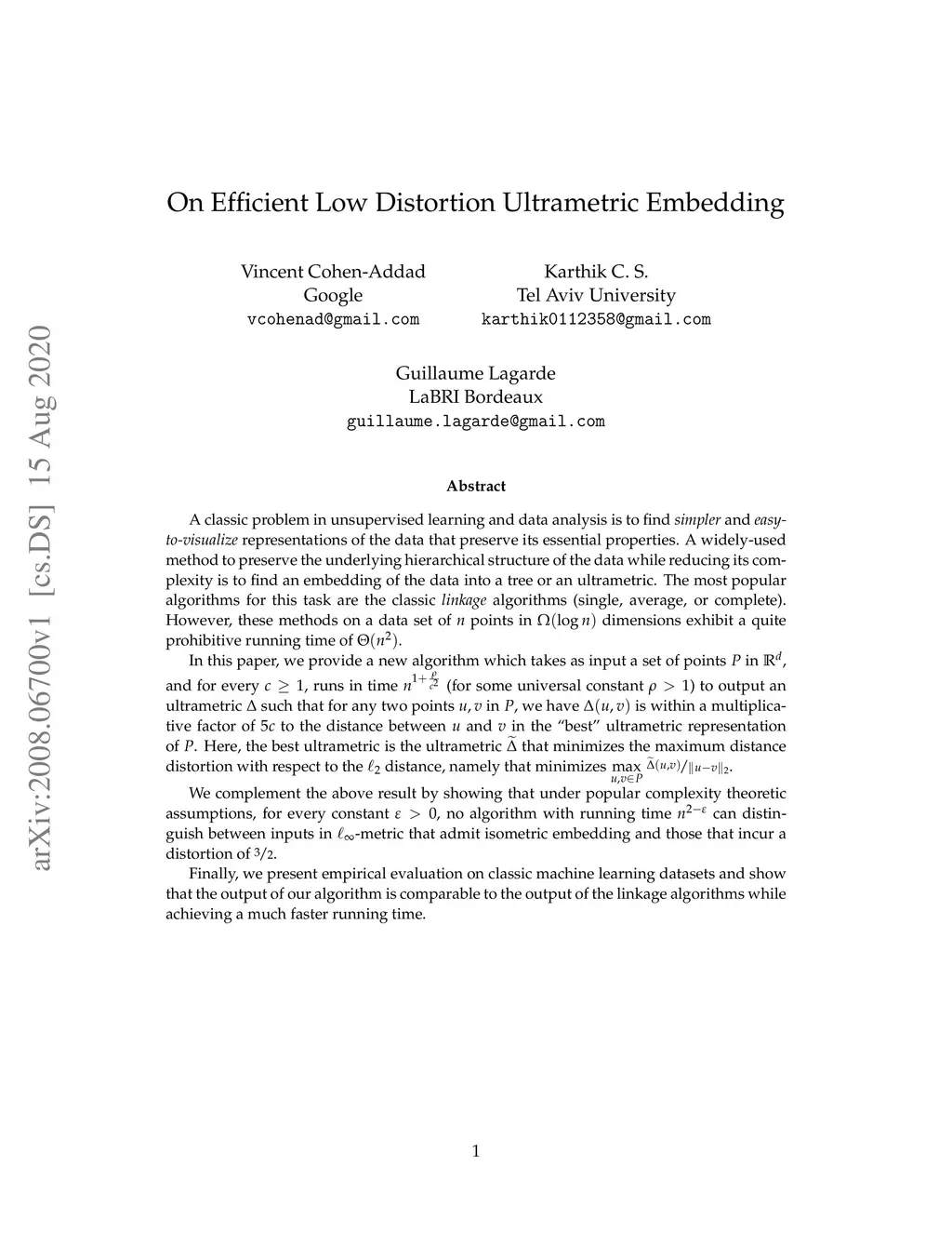 A classic problem in unsupervised learning and data analysis is to find simpler and easy-to-visualize representations of the data that preserve its essential properties. A widely-used method to preserve the underlying hierarchical structure of the data while reducing its complexity is to find an embedding of the data into a tree or an ultrametric. The most popular algorithms for this task are the classic linkage algorithms (single, average, or complete). However, these methods on a data set of points in dimensions exhibit a quite prohibitive running time of . In this paper, we provide a new algorithm which takes as input a set of points in , and for every , runs in time (for some universal constant ) to output an ultrametric such that for any two points in , we have is within a multiplicative factor of to the distance between and in the "best" ultrametric representation of . Here, the best ultrametric is the ultrametric that minimizes the maximum distance distortion with respect to the distance, namely that minimizes . We complement the above result by showing that under popular complexity theoretic assumptions, for every constant , no algorithm with running time can distinguish between inputs in -metric that admit isometric embedding and those that incur a distortion of . Finally, we present empirical evaluation on classic machine learning datasets and show that the output of our algorithm is comparable to the output of the linkage algorithms while achieving a much faster running time.