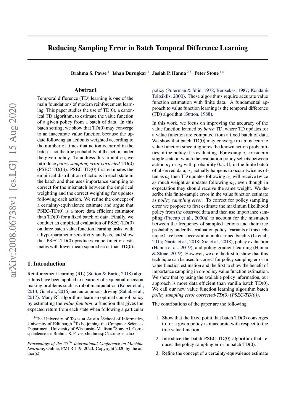 Temporal difference (TD) learning is one of the main foundations of modern reinforcement learning. This paper studies the use of TD(0), a canonical TD algorithm, to estimate the value function of a given policy from a batch of data. In this batch setting, we show that TD(0) may converge to an inaccurate value function because the update following an action is weighted according to the number of times that action occurred in the batch -- not the true probability of the action under the given policy. To address this limitation, we introduce \textit{policy sampling error corrected}-TD(0) (PSEC-TD(0)). PSEC-TD(0) first estimates the empirical distribution of actions in each state in the batch and then uses importance sampling to correct for the mismatch between the empirical weighting and the correct weighting for updates following each action. We refine the concept of a certainty-equivalence estimate and argue that PSEC-TD(0) is a more data efficient estimator than TD(0) for a fixed batch of data. Finally, we conduct an empirical evaluation of PSEC-TD(0) on three batch value function learning tasks, with a hyperparameter sensitivity analysis, and show that PSEC-TD(0) produces value function estimates with lower mean squared error than TD(0).