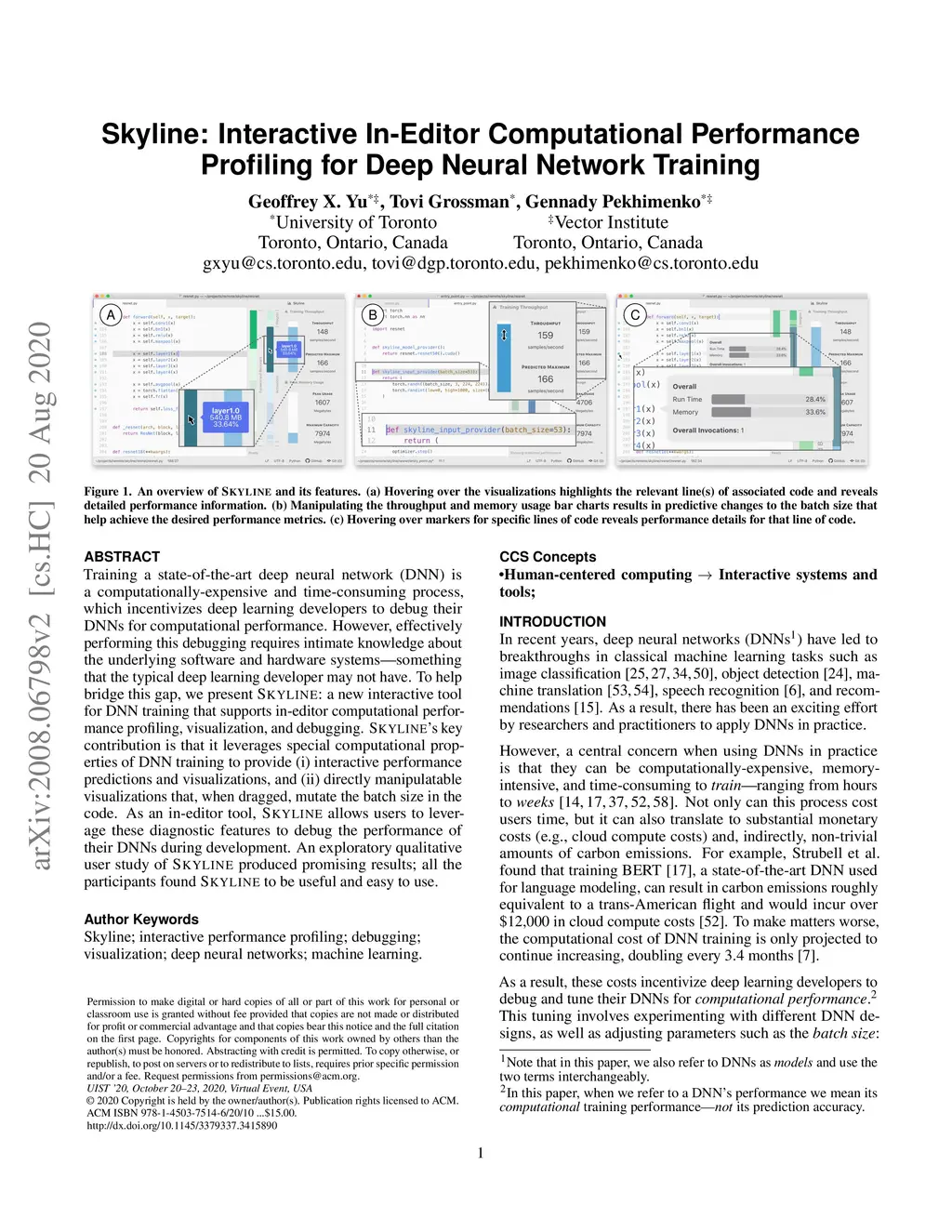 Training a state-of-the-art deep neural network (DNN) is a computationally-expensive and time-consuming process, which incentivizes deep learning developers to debug their DNNs for computational performance. However, effectively performing this debugging requires intimate knowledge about the underlying software and hardware systems---something that the typical deep learning developer may not have. To help bridge this gap, we present Skyline: a new interactive tool for DNN training that supports in-editor computational performance profiling, visualization, and debugging. Skyline's key contribution is that it leverages special computational properties of DNN training to provide (i) interactive performance predictions and visualizations, and (ii) directly manipulatable visualizations that, when dragged, mutate the batch size in the code. As an in-editor tool, Skyline allows users to leverage these diagnostic features to debug the performance of their DNNs during development. An exploratory qualitative user study of Skyline produced promising results; all the participants found Skyline to be useful and easy to use.