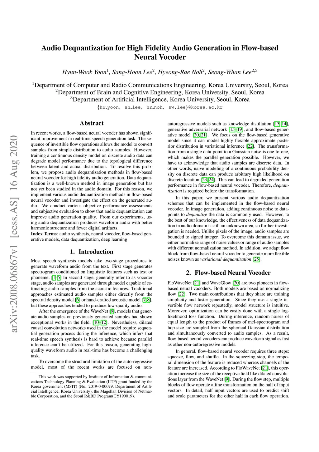 In recent works, a flow-based neural vocoder has shown significant improvement in real-time speech generation task. The sequence of invertible flow operations allows the model to convert samples from simple distribution to audio samples. However, training a continuous density model on discrete audio data can degrade model performance due to the topological difference between latent and actual distribution. To resolve this problem, we propose audio dequantization methods in flow-based neural vocoder for high fidelity audio generation. Data dequantization is a well-known method in image generation but has not yet been studied in the audio domain. For this reason, we implement various audio dequantization methods in flow-based neural vocoder and investigate the effect on the generated audio. We conduct various objective performance assessments and subjective evaluation to show that audio dequantization can improve audio generation quality. From our experiments, using audio dequantization produces waveform audio with better harmonic structure and fewer digital artifacts.