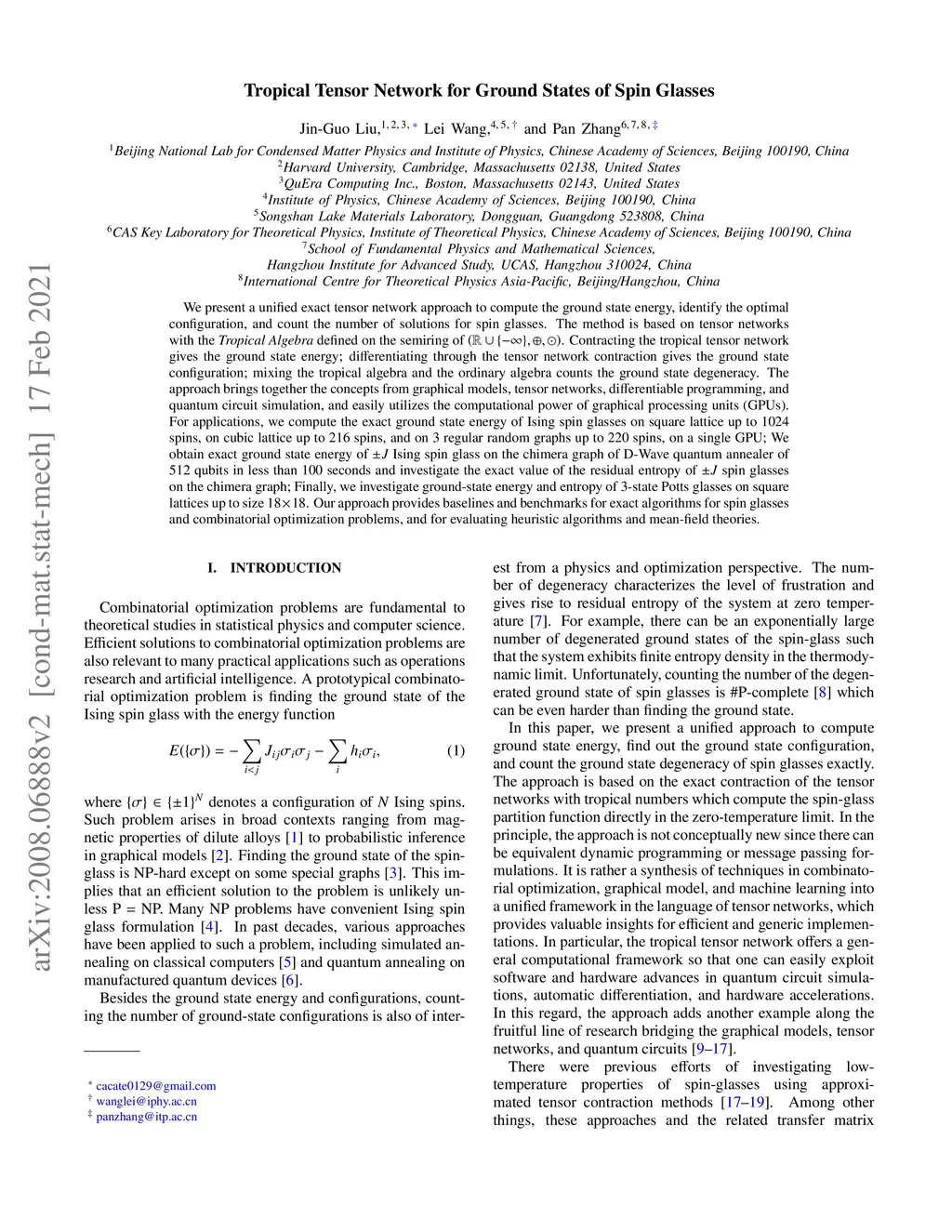 Tropical Tensor Network for Ground States of Spin Glasses