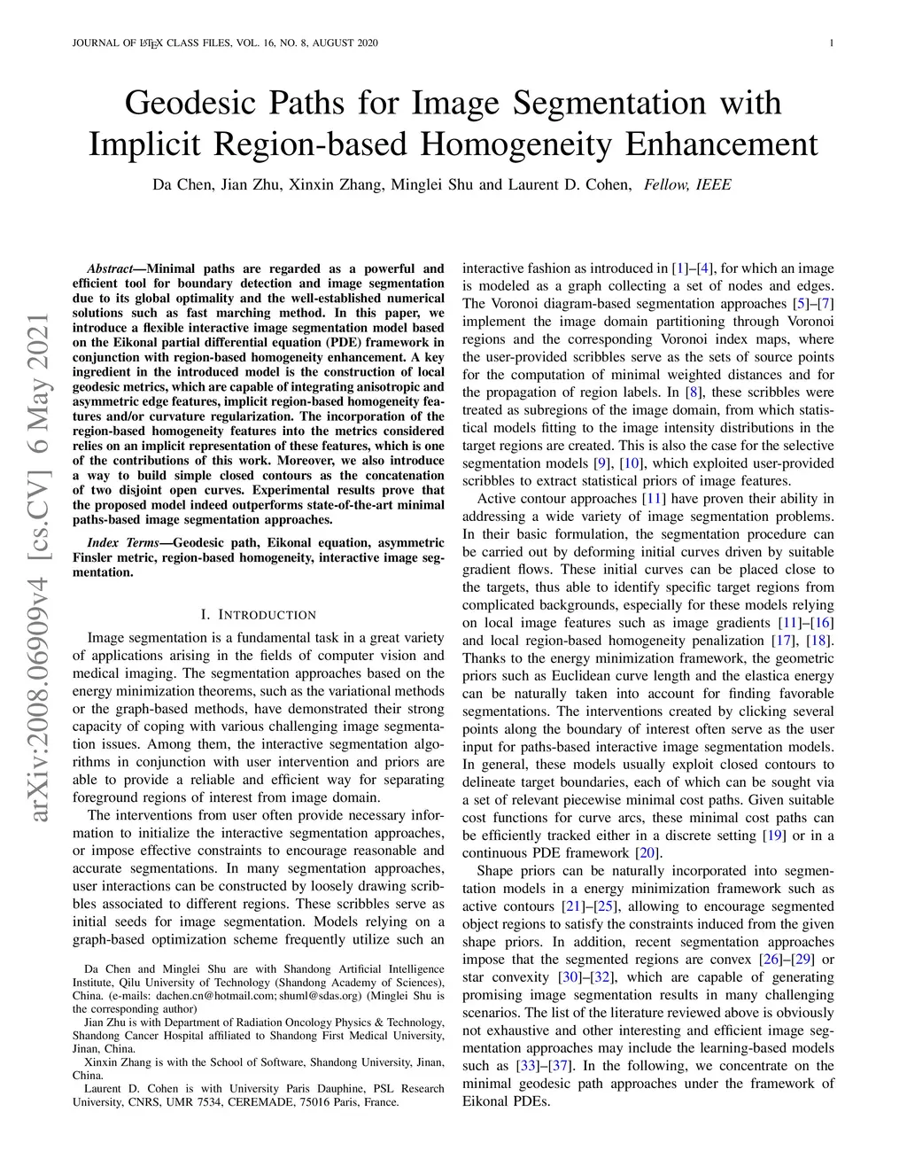 Minimal paths are regarded as a powerful and efficient tool for boundary detection and image segmentation due to its global optimality and the well-established numerical solutions such as fast marching method. In this paper, we introduce a flexible interactive image segmentation model based on the Eikonal partial differential equation (PDE) framework in conjunction with region-based homogeneity enhancement. A key ingredient in the introduced model is the construction of local geodesic metrics, which are capable of integrating anisotropic and asymmetric edge features, implicit region-based homogeneity features and/or curvature regularization. The incorporation of the region-based homogeneity features into the metrics considered relies on an implicit representation of these features, which is one of the contributions of this work. Moreover, we also introduce a way to build simple closed contours as the concatenation of two disjoint open curves. Experimental results prove that the proposed model indeed outperforms state-of-the-art minimal paths-based image segmentation approaches.