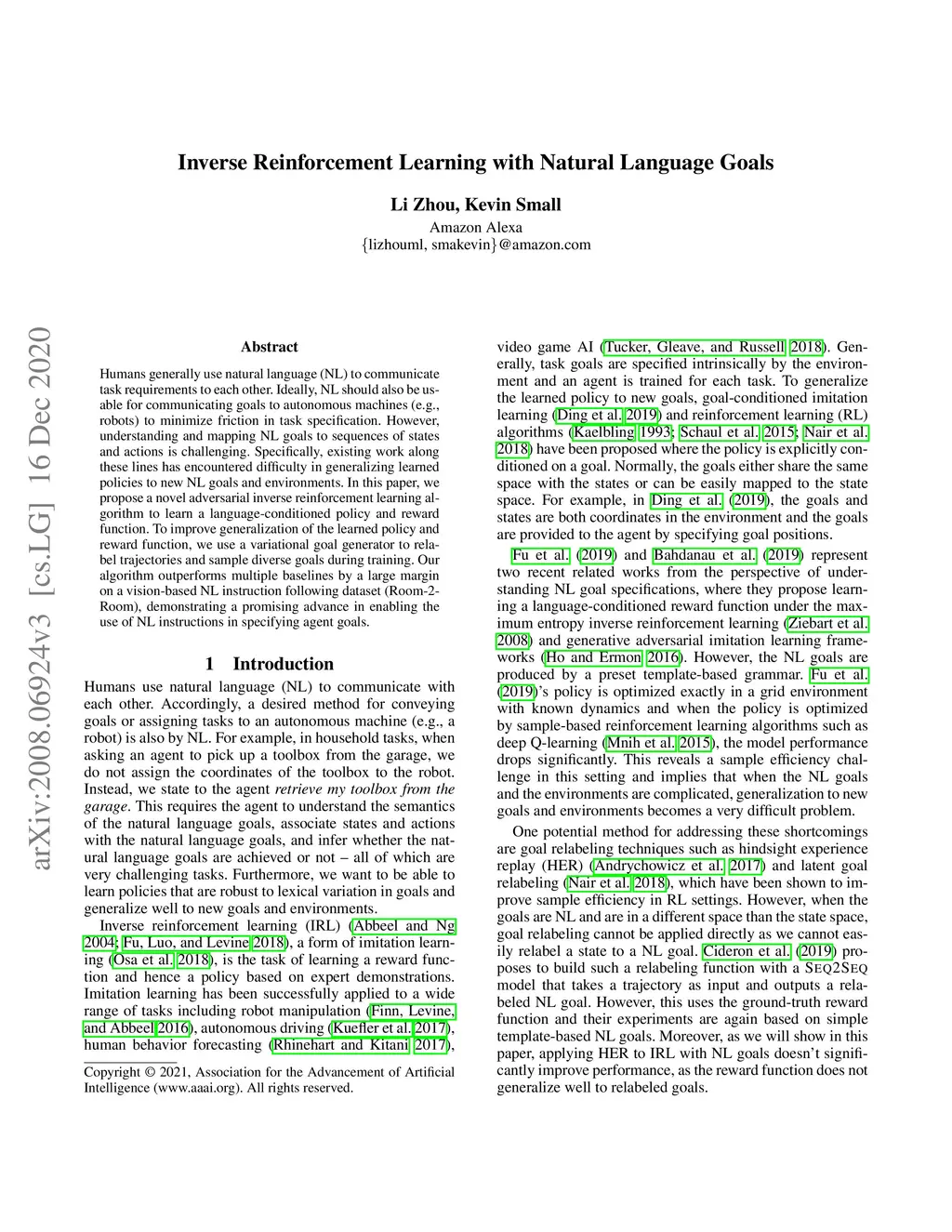 Humans generally use natural language to communicate task requirements to each other. Ideally, natural language should also be usable for communicating goals to autonomous machines (e.g., robots) to minimize friction in task specification. However, understanding and mapping natural language goals to sequences of states and actions is challenging. Specifically, existing work along these lines has encountered difficulty in generalizing learned policies to new natural language goals and environments. In this paper, we propose a novel adversarial inverse reinforcement learning algorithm to learn a language-conditioned policy and reward function. To improve generalization of the learned policy and reward function, we use a variational goal generator to relabel trajectories and sample diverse goals during training. Our algorithm outperforms multiple baselines by a large margin on a vision-based natural language instruction following dataset (Room-2-Room), demonstrating a promising advance in enabling the use of natural language instructions in specifying agent goals.