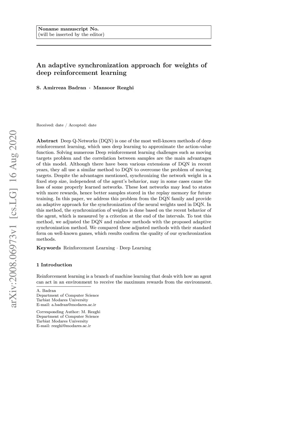 Deep Q-Networks (DQN) is one of the most well-known methods of deep reinforcement learning, which uses deep learning to approximate the action-value function. Solving numerous Deep reinforcement learning challenges such as moving targets problem and the correlation between samples are the main advantages of this model. Although there have been various extensions of DQN in recent years, they all use a similar method to DQN to overcome the problem of moving targets. Despite the advantages mentioned, synchronizing the network weight in a fixed step size, independent of the agent's behavior, may in some cases cause the loss of some properly learned networks. These lost networks may lead to states with more rewards, hence better samples stored in the replay memory for future training. In this paper, we address this problem from the DQN family and provide an adaptive approach for the synchronization of the neural weights used in DQN. In this method, the synchronization of weights is done based on the recent behavior of the agent, which is measured by a criterion at the end of the intervals. To test this method, we adjusted the DQN and rainbow methods with the proposed adaptive synchronization method. We compared these adjusted methods with their standard form on well-known games, which results confirm the quality of our synchronization methods.