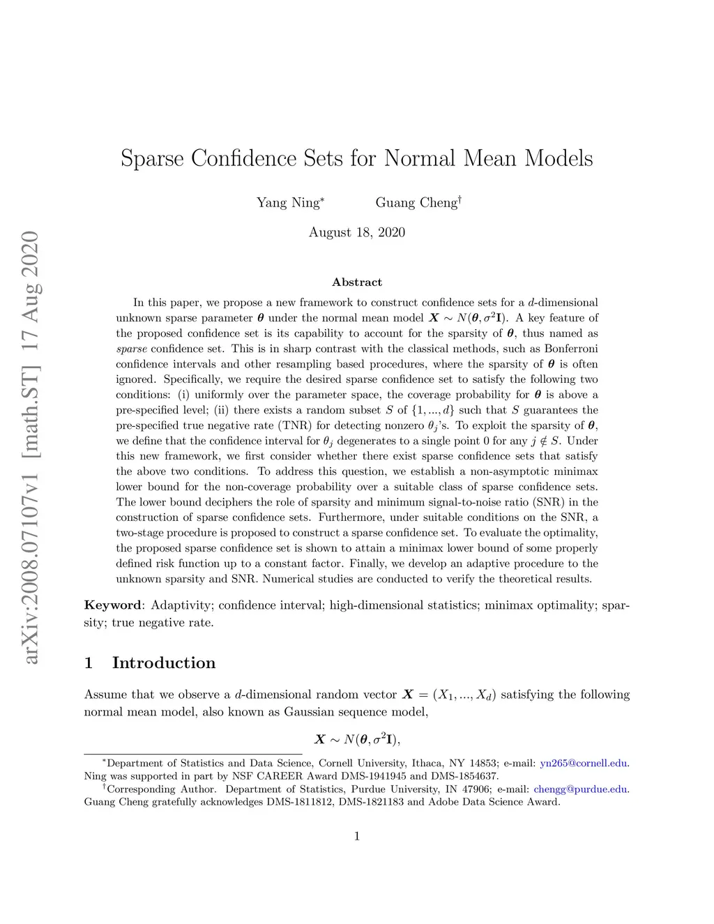 In this paper, we propose a new framework to construct confidence sets for a -dimensional unknown sparse parameter under the normal mean model . A key feature of the proposed confidence set is its capability to account for the sparsity of , thus named as {\em sparse} confidence set. This is in sharp contrast with the classical methods, such as Bonferroni confidence intervals and other resampling based procedures, where the sparsity of is often ignored. Specifically, we require the desired sparse confidence set to satisfy the following two conditions: (i) uniformly over the parameter space, the coverage probability for is above a pre-specified level; (ii) there exists a random subset of such that guarantees the pre-specified true negative rate (TNR) for detecting nonzero 's. To exploit the sparsity of , we define that the confidence interval for degenerates to a single point 0 for any . Under this new framework, we first consider whether there exist sparse confidence sets that satisfy the above two conditions. To address this question, we establish a non-asymptotic minimax lower bound for the non-coverage probability over a suitable class of sparse confidence sets. The lower bound deciphers the role of sparsity and minimum signal-to-noise ratio (SNR) in the construction of sparse confidence sets. Furthermore, under suitable conditions on the SNR, a two-stage procedure is proposed to construct a sparse confidence set. To evaluate the optimality, the proposed sparse confidence set is shown to attain a minimax lower bound of some properly defined risk function up to a constant factor. Finally, we develop an adaptive procedure to the unknown sparsity and SNR. Numerical studies are conducted to verify the theoretical results.