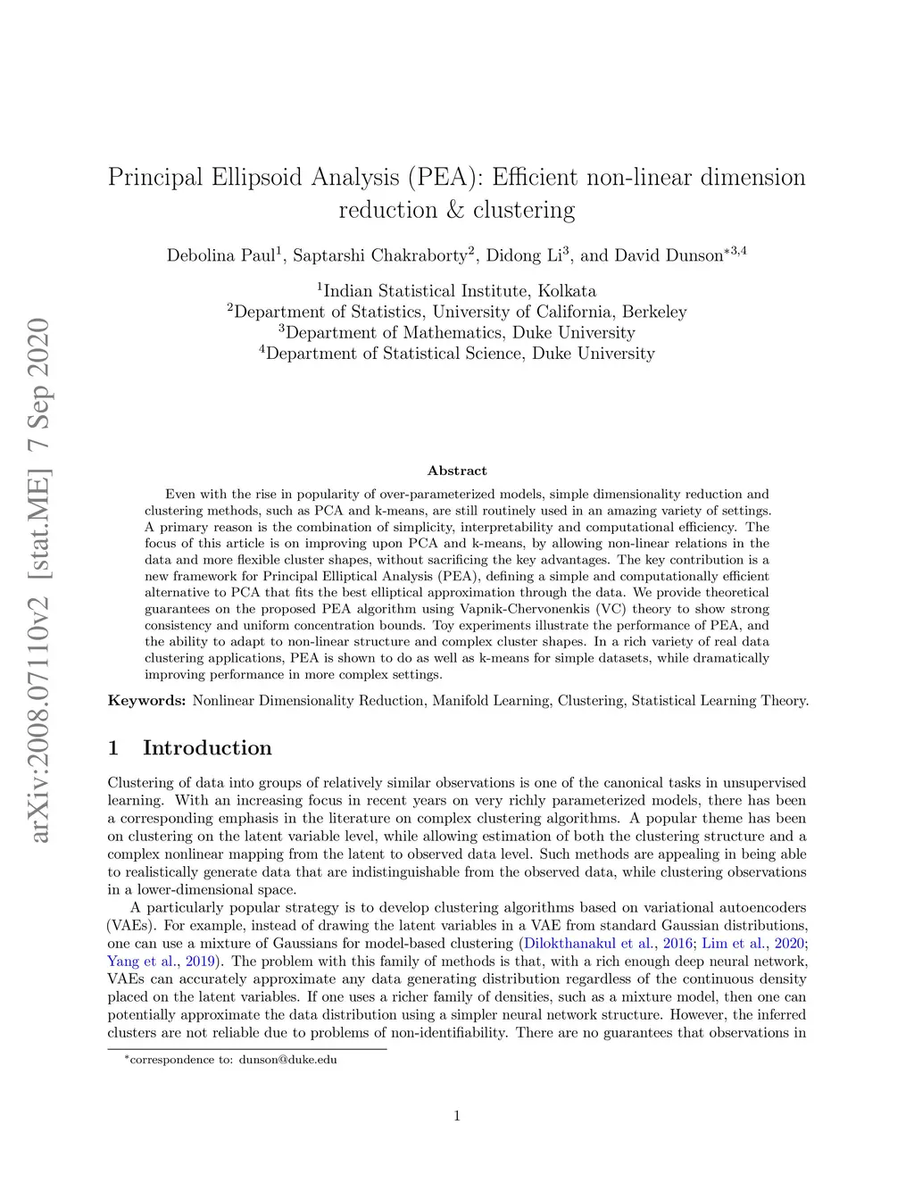 Even with the rise in popularity of over-parameterized models, simple dimensionality reduction and clustering methods, such as PCA and k-means, are still routinely used in an amazing variety of settings. A primary reason is the combination of simplicity, interpretability and computational efficiency. The focus of this article is on improving upon PCA and k-means, by allowing non-linear relations in the data and more flexible cluster shapes, without sacrificing the key advantages. The key contribution is a new framework for Principal Elliptical Analysis (PEA), defining a simple and computationally efficient alternative to PCA that fits the best elliptical approximation through the data. We provide theoretical guarantees on the proposed PEA algorithm using Vapnik-Chervonenkis (VC) theory to show strong consistency and uniform concentration bounds. Toy experiments illustrate the performance of PEA, and the ability to adapt to non-linear structure and complex cluster shapes. In a rich variety of real data clustering applications, PEA is shown to do as well as k-means for simple datasets, while dramatically improving performance in more complex settings.