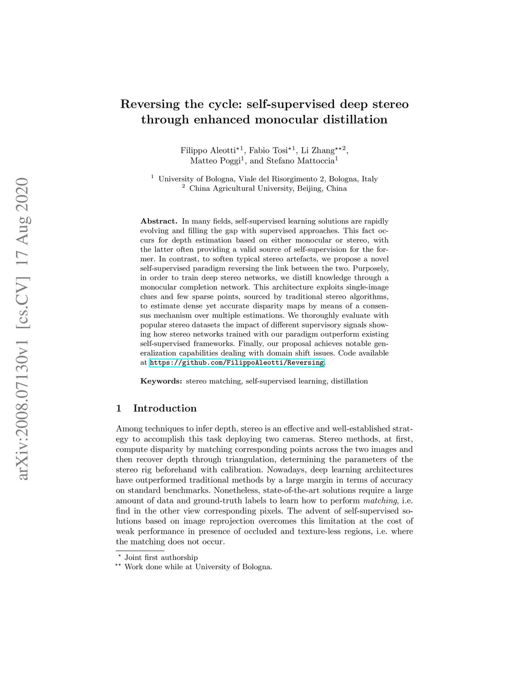 In many fields, self-supervised learning solutions are rapidly evolving and filling the gap with supervised approaches. This fact occurs for depth estimation based on either monocular or stereo, with the latter often providing a valid source of self-supervision for the former. In contrast, to soften typical stereo artefacts, we propose a novel self-supervised paradigm reversing the link between the two. Purposely, in order to train deep stereo networks, we distill knowledge through a monocular completion network. This architecture exploits single-image clues and few sparse points, sourced by traditional stereo algorithms, to estimate dense yet accurate disparity maps by means of a consensus mechanism over multiple estimations. We thoroughly evaluate with popular stereo datasets the impact of different supervisory signals showing how stereo networks trained with our paradigm outperform existing self-supervised frameworks. Finally, our proposal achieves notable generalization capabilities dealing with domain shift issues. Code available at https://github.com/FilippoAleotti/Reversing