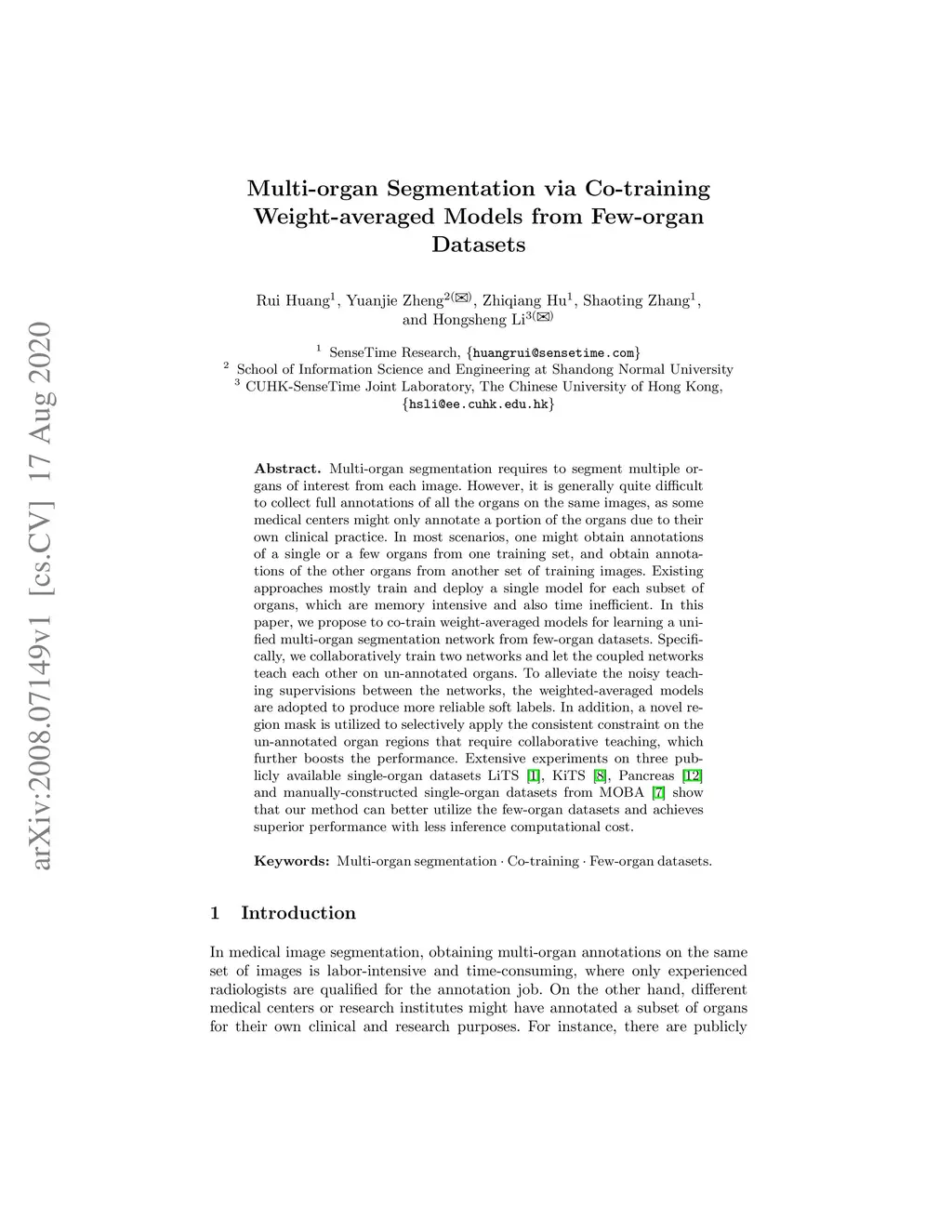 Multi-organ Segmentation via Co-training Weight-averaged Models from