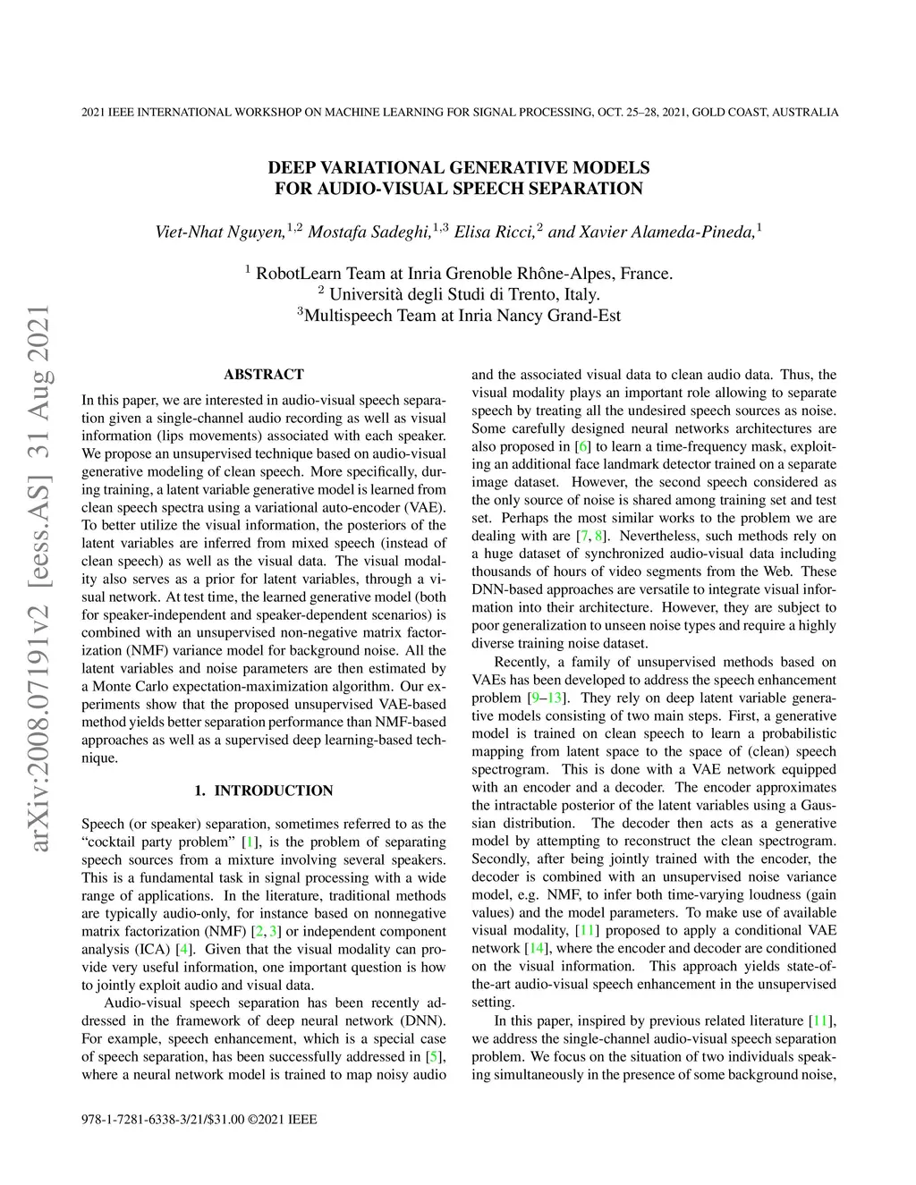Deep Variational Generative Models for Audio-visual Speech Separation