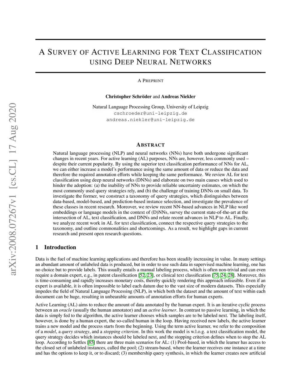 Natural language processing (NLP) and neural networks (NNs) have both undergone significant changes in recent years. For active learning (AL) purposes, NNs are, however, less commonly used -- despite their current popularity. By using the superior text classification performance of NNs for AL, we can either increase a model's performance using the same amount of data or reduce the data and therefore the required annotation efforts while keeping the same performance. We review AL for text classification using deep neural networks (DNNs) and elaborate on two main causes which used to hinder the adoption: (a) the inability of NNs to provide reliable uncertainty estimates, on which the most commonly used query strategies rely, and (b) the challenge of training DNNs on small data. To investigate the former, we construct a taxonomy of query strategies, which distinguishes between data-based, model-based, and prediction-based instance selection, and investigate the prevalence of these classes in recent research. Moreover, we review recent NN-based advances in NLP like word embeddings or language models in the context of (D)NNs, survey the current state-of-the-art at the intersection of AL, text classification, and DNNs and relate recent advances in NLP to AL. Finally, we analyze recent work in AL for text classification, connect the respective query strategies to the taxonomy, and outline commonalities and shortcomings. As a result, we highlight gaps in current research and present open research questions.