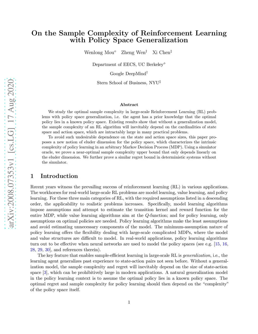 We study the optimal sample complexity in large-scale Reinforcement Learning (RL) problems with policy space generalization, i.e. the agent has a prior knowledge that the optimal policy lies in a known policy space. Existing results show that without a generalization model, the sample complexity of an RL algorithm will inevitably depend on the cardinalities of state space and action space, which are intractably large in many practical problems. To avoid such undesirable dependence on the state and action space sizes, this paper proposes a new notion of eluder dimension for the policy space, which characterizes the intrinsic complexity of policy learning in an arbitrary Markov Decision Process (MDP). Using a simulator oracle, we prove a near-optimal sample complexity upper bound that only depends linearly on the eluder dimension. We further prove a similar regret bound in deterministic systems without the simulator.