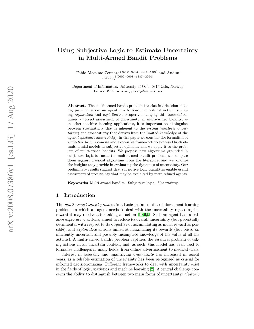 Using Subjective Logic to Estimate Uncertainty in Multi-Armed Bandit