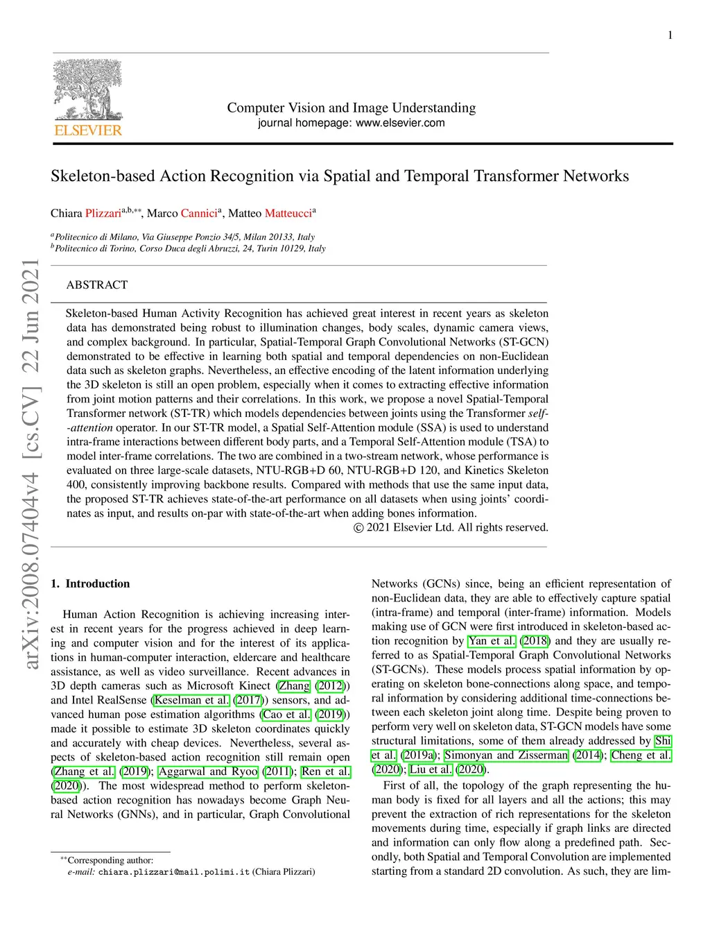 Skeleton-based Action Recognition via Spatial and Temporal Transformer
