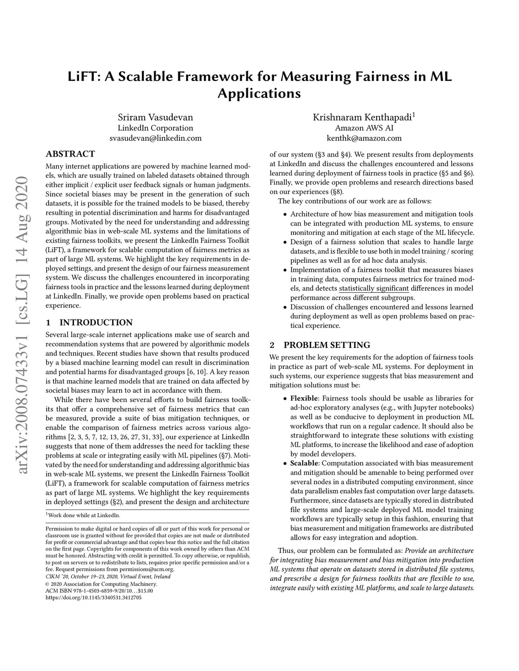 Many internet applications are powered by machine learned models, which are usually trained on labeled datasets obtained through either implicit / explicit user feedback signals or human judgments. Since societal biases may be present in the generation of such datasets, it is possible for the trained models to be biased, thereby resulting in potential discrimination and harms for disadvantaged groups. Motivated by the need for understanding and addressing algorithmic bias in web-scale ML systems and the limitations of existing fairness toolkits, we present the LinkedIn Fairness Toolkit (LiFT), a framework for scalable computation of fairness metrics as part of large ML systems. We highlight the key requirements in deployed settings, and present the design of our fairness measurement system. We discuss the challenges encountered in incorporating fairness tools in practice and the lessons learned during deployment at LinkedIn. Finally, we provide open problems based on practical experience.
