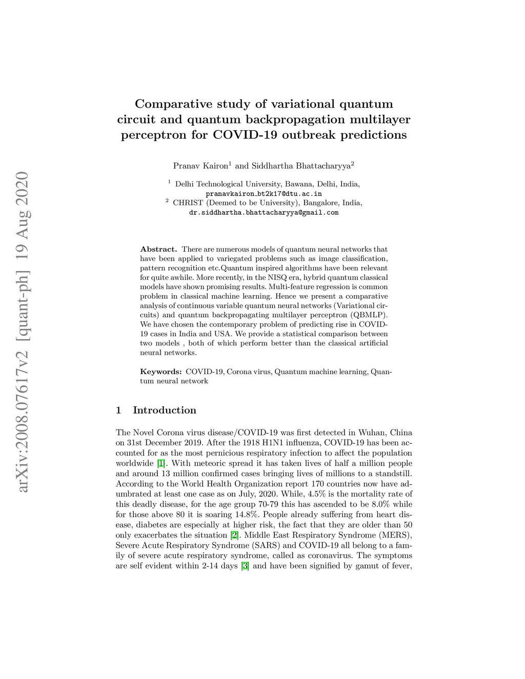 There are numerous models of quantum neural networks that have been applied to variegated problems such as image classification, pattern recognition etc.Quantum inspired algorithms have been relevant for quite awhile. More recently, in the NISQ era, hybrid quantum classical models have shown promising results. Multi-feature regression is common problem in classical machine learning. Hence we present a comparative analysis of continuous variable quantum neural networks (Variational circuits) and quantum backpropagating multi layer perceptron (QBMLP). We have chosen the contemporary problem of predicting rise in COVID-19 cases in India and USA. We provide a statistical comparison between two models , both of which perform better than the classical artificial neural networks.