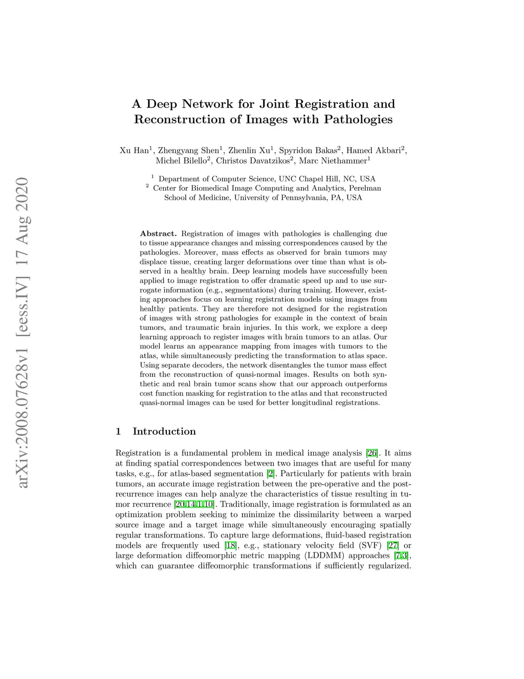 Registration of images with pathologies is challenging due to tissue appearance changes and missing correspondences caused by the pathologies. Moreover, mass effects as observed for brain tumors may displace tissue, creating larger deformations over time than what is observed in a healthy brain. Deep learning models have successfully been applied to image registration to offer dramatic speed up and to use surrogate information (e.g., segmentations) during training. However, existing approaches focus on learning registration models using images from healthy patients. They are therefore not designed for the registration of images with strong pathologies for example in the context of brain tumors, and traumatic brain injuries. In this work, we explore a deep learning approach to register images with brain tumors to an atlas. Our model learns an appearance mapping from images with tumors to the atlas, while simultaneously predicting the transformation to atlas space. Using separate decoders, the network disentangles the tumor mass effect from the reconstruction of quasi-normal images. Results on both synthetic and real brain tumor scans show that our approach outperforms cost function masking for registration to the atlas and that reconstructed quasi-normal images can be used for better longitudinal registrations.