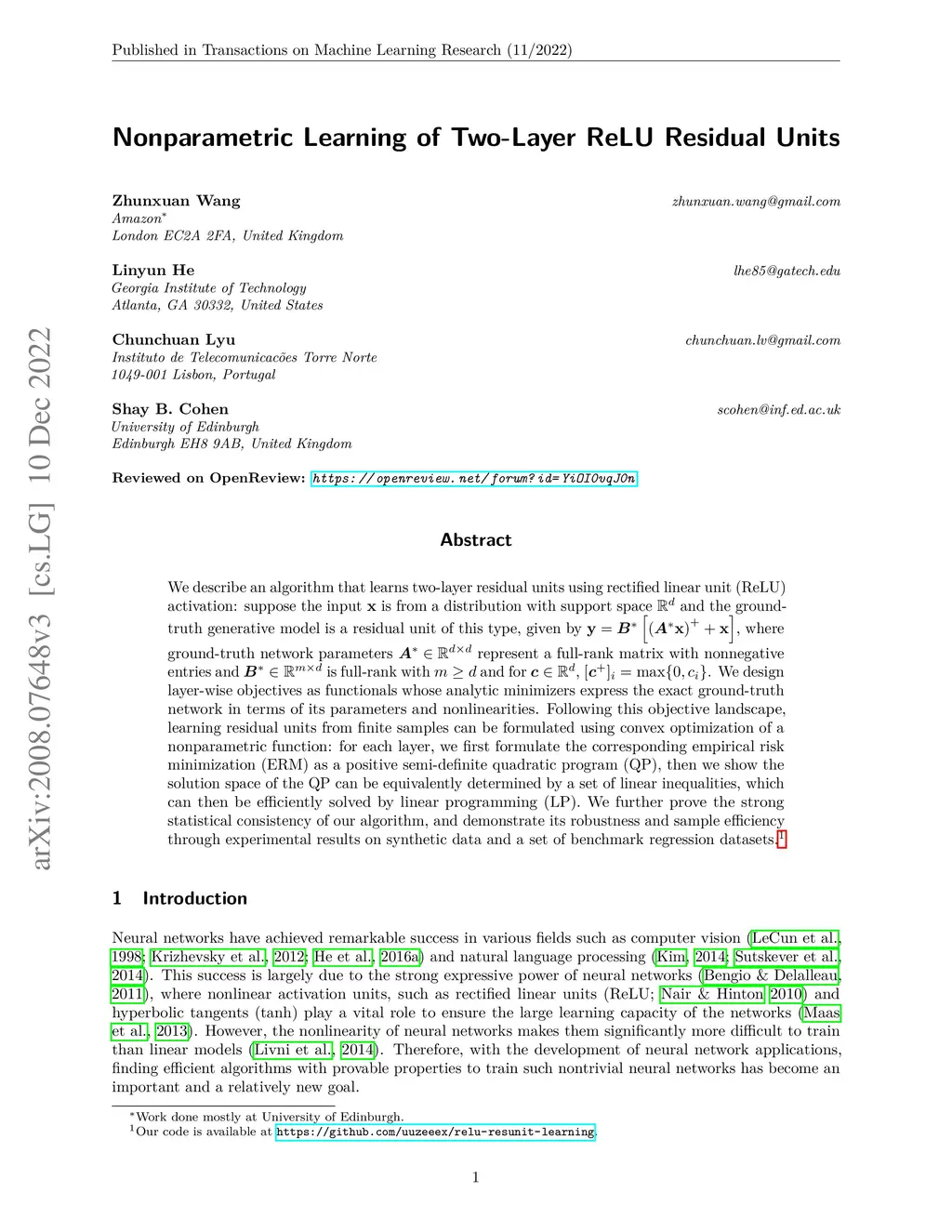 We describe an algorithm that learns two-layer residual units using rectified linear unit (ReLU) activation: suppose the input is from a distribution with support space and the ground-truth generative model is a residual unit of this type, given by , where ground-truth network parameters represent a full-rank matrix with nonnegative entries and is full-rank with and for , . We design layer-wise objectives as functionals whose analytic minimizers express the exact ground-truth network in terms of its parameters and nonlinearities. Following this objective landscape, learning residual units from finite samples can be formulated using convex optimization of a nonparametric function: for each layer, we first formulate the corresponding empirical risk minimization (ERM) as a positive semi-definite quadratic program (QP), then we show the solution space of the QP can be equivalently determined by a set of linear inequalities, which can then be efficiently solved by linear programming (LP). We further prove the strong statistical consistency of our algorithm, and demonstrate its robustness and sample efficiency through experimental results on synthetic data and a set of benchmark regression datasets.