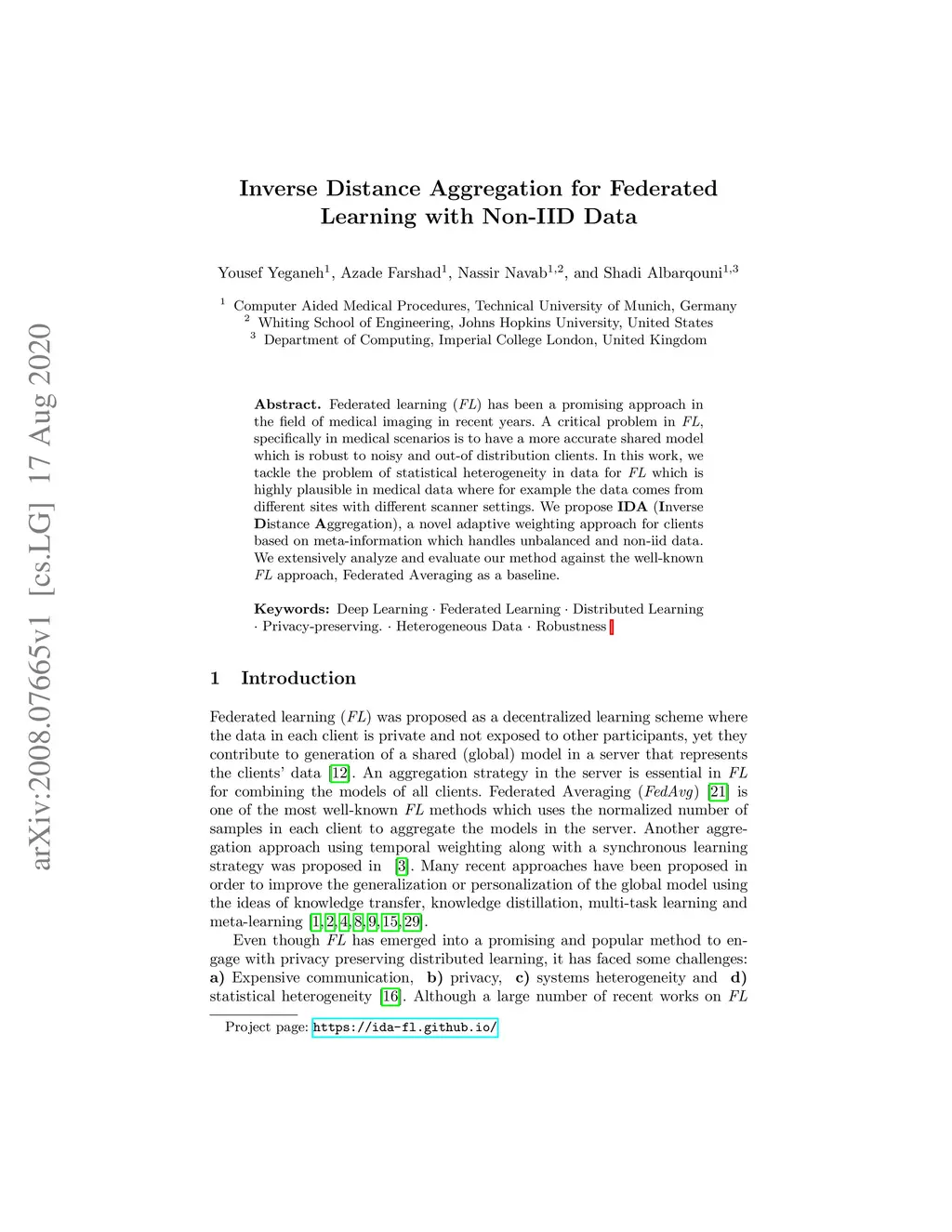 Federated learning (FL) has been a promising approach in the field of medical imaging in recent years. A critical problem in FL, specifically in medical scenarios is to have a more accurate shared model which is robust to noisy and out-of distribution clients. In this work, we tackle the problem of statistical heterogeneity in data for FL which is highly plausible in medical data where for example the data comes from different sites with different scanner settings. We propose IDA (Inverse Distance Aggregation), a novel adaptive weighting approach for clients based on meta-information which handles unbalanced and non-iid data. We extensively analyze and evaluate our method against the well-known FL approach, Federated Averaging as a baseline.