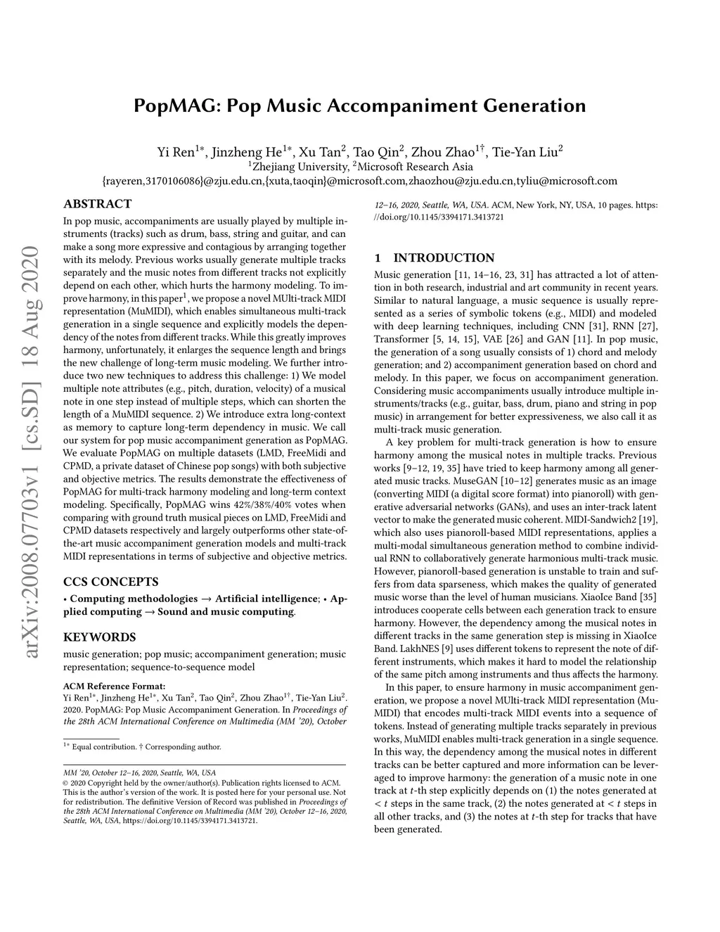In pop music, accompaniments are usually played by multiple instruments (tracks) such as drum, bass, string and guitar, and can make a song more expressive and contagious by arranging together with its melody. Previous works usually generate multiple tracks separately and the music notes from different tracks not explicitly depend on each other, which hurts the harmony modeling. To improve harmony, in this paper, we propose a novel MUlti-track MIDI representation (MuMIDI), which enables simultaneous multi-track generation in a single sequence and explicitly models the dependency of the notes from different tracks. While this greatly improves harmony, unfortunately, it enlarges the sequence length and brings the new challenge of long-term music modeling. We further introduce two new techniques to address this challenge: 1) We model multiple note attributes (e.g., pitch, duration, velocity) of a musical note in one step instead of multiple steps, which can shorten the length of a MuMIDI sequence. 2) We introduce extra long-context as memory to capture long-term dependency in music. We call our system for pop music accompaniment generation as PopMAG. We evaluate PopMAG on multiple datasets (LMD, FreeMidi and CPMD, a private dataset of Chinese pop songs) with both subjective and objective metrics. The results demonstrate the effectiveness of PopMAG for multi-track harmony modeling and long-term context modeling. Specifically, PopMAG wins 42\%/38\%/40\% votes when comparing with ground truth musical pieces on LMD, FreeMidi and CPMD datasets respectively and largely outperforms other state-of-the-art music accompaniment generation models and multi-track MIDI representations in terms of subjective and objective metrics.