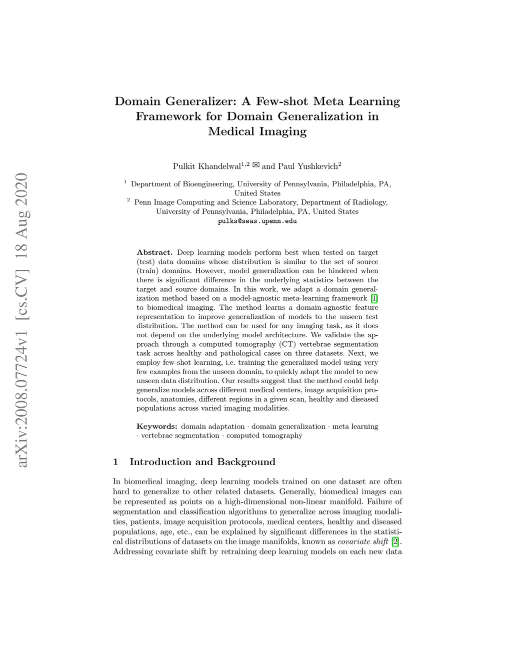 Deep learning models perform best when tested on target (test) data domains whose distribution is similar to the set of source (train) domains. However, model generalization can be hindered when there is significant difference in the underlying statistics between the target and source domains. In this work, we adapt a domain generalization method based on a model-agnostic meta-learning framework to biomedical imaging. The method learns a domain-agnostic feature representation to improve generalization of models to the unseen test distribution. The method can be used for any imaging task, as it does not depend on the underlying model architecture. We validate the approach through a computed tomography (CT) vertebrae segmentation task across healthy and pathological cases on three datasets. Next, we employ few-shot learning, i.e. training the generalized model using very few examples from the unseen domain, to quickly adapt the model to new unseen data distribution. Our results suggest that the method could help generalize models across different medical centers, image acquisition protocols, anatomies, different regions in a given scan, healthy and diseased populations across varied imaging modalities.