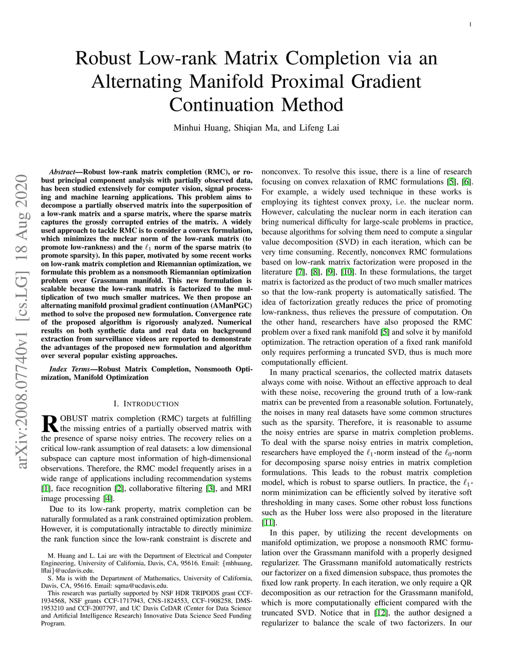 Robust low-rank matrix completion (RMC), or robust principal component analysis with partially observed data, has been studied extensively for computer vision, signal processing and machine learning applications. This problem aims to decompose a partially observed matrix into the superposition of a low-rank matrix and a sparse matrix, where the sparse matrix captures the grossly corrupted entries of the matrix. A widely used approach to tackle RMC is to consider a convex formulation, which minimizes the nuclear norm of the low-rank matrix (to promote low-rankness) and the l1 norm of the sparse matrix (to promote sparsity). In this paper, motivated by some recent works on low-rank matrix completion and Riemannian optimization, we formulate this problem as a nonsmooth Riemannian optimization problem over Grassmann manifold. This new formulation is scalable because the low-rank matrix is factorized to the multiplication of two much smaller matrices. We then propose an alternating manifold proximal gradient continuation (AManPGC) method to solve the proposed new formulation. The convergence rate of the proposed algorithm is rigorously analyzed. Numerical results on both synthetic data and real data on background extraction from surveillance videos are reported to demonstrate the advantages of the proposed new formulation and algorithm over several popular existing approaches.
