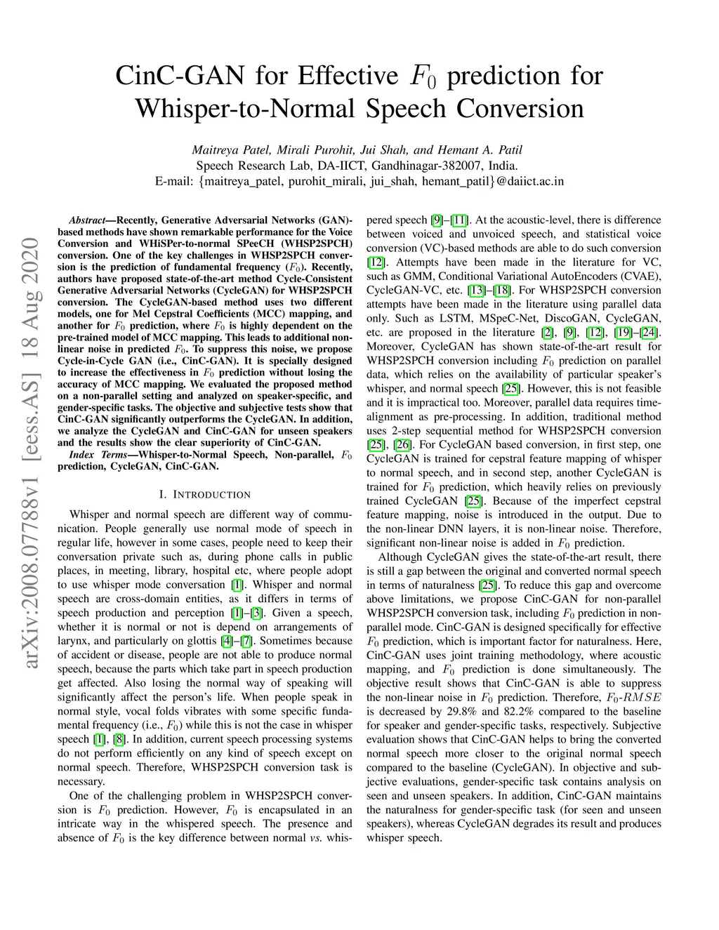 Recently, Generative Adversarial Networks (GAN)-based methods have shown remarkable performance for the Voice Conversion and WHiSPer-to-normal SPeeCH (WHSP2SPCH) conversion. One of the key challenges in WHSP2SPCH conversion is the prediction of fundamental frequency (F0). Recently, authors have proposed state-of-the-art method Cycle-Consistent Generative Adversarial Networks (CycleGAN) for WHSP2SPCH conversion. The CycleGAN-based method uses two different models, one for Mel Cepstral Coefficients (MCC) mapping, and another for F0 prediction, where F0 is highly dependent on the pre-trained model of MCC mapping. This leads to additional non-linear noise in predicted F0. To suppress this noise, we propose Cycle-in-Cycle GAN (i.e., CinC-GAN). It is specially designed to increase the effectiveness in F0 prediction without losing the accuracy of MCC mapping. We evaluated the proposed method on a non-parallel setting and analyzed on speaker-specific, and gender-specific tasks. The objective and subjective tests show that CinC-GAN significantly outperforms the CycleGAN. In addition, we analyze the CycleGAN and CinC-GAN for unseen speakers and the results show the clear superiority of CinC-GAN.